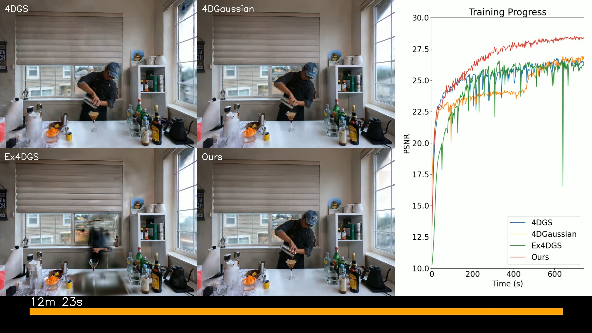 ์ด ์ฐ๊ตฌ๋ ๋์ 3D ์ฅ๋ฉด ์ฌ๊ตฌ์ฑ์ ์ํ ์๋ก์ด ํ๋ ์์ํฌ์ธ ํ์ด๋ธ๋ฆฌ๋ 3D-4D ๊ฐ์ฐ์์ ์คํ๋ํ (3D-4DGS)์ ์๊ฐํ๋ค. ๊ธฐ์กด 4D ๊ฐ์ฐ์์ ์คํ๋ํ (4DGS) ๋ฐฉ๋ฒ์ ์ ์ ์์ญ์ 4D ๊ฐ์ฐ์์์ ์ค๋ณต ํ ๋นํ์ฌ ๊ณ์ฐ ๋ฐ ๋ฉ๋ชจ๋ฆฌ ์ค๋ฒํค๋๋ฅผ ์ด๋ํ๋ ๋ฌธ์ ๋ฅผ ํด๊ฒฐํ๋ค. 3D-4DGS๋ ์ ์ ์์ญ์ 3D ๊ฐ์ฐ์์์ผ๋ก ์ ์์ ์ผ๋ก ํํํ๊ณ ๋์ ์์์๋ง 4D ๊ฐ์ฐ์์์ ํ ๋นํจ์ผ๋ก์จ, ๋งค๊ฐ๋ณ์ ์๋ฅผ ํฌ๊ฒ ์ค์ด๊ณ ๊ณ์ฐ ํจ์จ์ฑ์ ํฅ์์ํจ๋ค. ์ด ๋ฐฉ๋ฒ์ ์ ์ฒด 4D ๊ฐ์ฐ์์ ํํ์ผ๋ก ์์ํ์ฌ ์๊ฐ์ ์ผ๋ก ๋ถ๋ณํ๋ ๊ฐ์ฐ์์์ 3D๋ก ์ ์ง์ ์ผ๋ก ๋ณํํ๋ค. ์ด๋ฅผ ํตํด ๋ณต์กํ ์์ง์์ ๊ณ ํ์ง๋ก ์บก์ฒํ๋ฉด์๋ ๊ธฐ์กด 4DGS ๋ฐฉ๋ฒ์ ๋นํด ํ๋ จ ์๊ฐ์ ํฌ๊ฒ ๋จ์ถํ๊ณ ์๊ฐ์ ํ์ง์ ์ ์งํ๊ฑฐ๋ ํฅ์์ํค๋ ๊ฒฐ๊ณผ๋ฅผ ๋ณด์ฌ์ค๋ค.