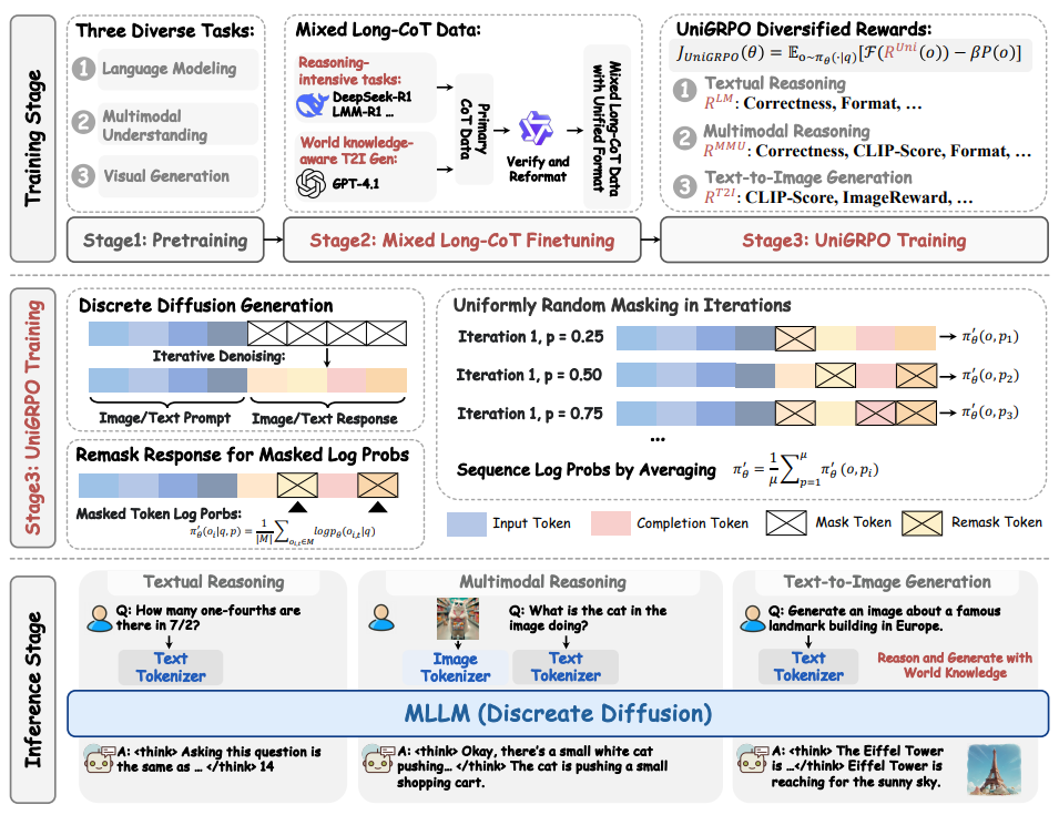 ์ด ๋ ผ๋ฌธ์ ํ ์คํธ ์ถ๋ก , ๋ฉํฐ๋ชจ๋ฌ ์ดํด, ํ ์คํธ-์ด๋ฏธ์ง ์์ฑ ๋ฑ ๋ค์ํ ์์ญ์์ ๋ฐ์ด๋ ์ฑ๋ฅ์ ๋ฌ์ฑํ๋๋ก ์ค๊ณ๋ ์๋ก์ด ๋ฉํฐ๋ชจ๋ฌ ํ์ฐ ๊ธฐ๋ฐ ๋ชจ๋ธ์ธ MMaDA๋ฅผ ์๊ฐํ๋ค. MMaDA๋ ํตํฉ ํ์ฐ ์ํคํ ์ฒ๋ฅผ ์ฑํํ์ฌ ์์๋ณ ๊ตฌ์ฑ ์์ ์์ด ๋ค์ํ ๋ฐ์ดํฐ ์ ํ์ ์ํํ๊ฒ ํตํฉํ๊ณ ์ฒ๋ฆฌํ๋ค. ๋ํ, ํ ์คํธ ๋ฐ ์๊ฐ ๋๋ฉ์ธ ๊ฐ์ ์ถ๋ก ๊ณผ์ ์ ์ ๋ ฌํ๋ ํผํฉ๋ ๊ธด ์ฌ๊ณ ์ ์ฐ์(CoT) ๋ฏธ์ธ ์กฐ์ ์ ๋ต์ ํตํด ๊ฐํ ํ์ต ๋จ๊ณ์ ์ฝ๋ ์คํํธ ํ์ต์ ์ฉ์ดํ๊ฒ ํ๋ค. ๋ง์ง๋ง์ผ๋ก, ํ์ฐ ๊ธฐ๋ฐ ๋ชจ๋ธ์ ํนํ๋ UniGRPO๋ผ๋ ํตํฉ ์ ์ฑ ๊ธฐ์ธ๊ธฐ ๊ธฐ๋ฐ ๊ฐํ ํ์ต ์๊ณ ๋ฆฌ์ฆ์ ์ ์ํ์ฌ ์ถ๋ก ๋ฐ ์์ฑ ์์ ์ ๋ฐ์ ๊ฑธ์ณ ์ผ๊ด๋ ์ฑ๋ฅ ํฅ์์ ๋ณด์ฅํ๋ค. MMaDA-8B๋ ํ ์คํธ ์ถ๋ก ์์ LLaMA-3-7B ๋ฐ Qwen2-7B๋ฅผ, ๋ฉํฐ๋ชจ๋ฌ ์ดํด์์ Show-o ๋ฐ SEED-X๋ฅผ, ํ ์คํธ-์ด๋ฏธ์ง ์์ฑ์์ SDXL ๋ฐ Janus๋ฅผ ๋ฅ๊ฐํ๋ ๊ฐ๋ ฅํ ์ฑ๋ฅ์ ๋ณด์ฌ์ค๋ค.