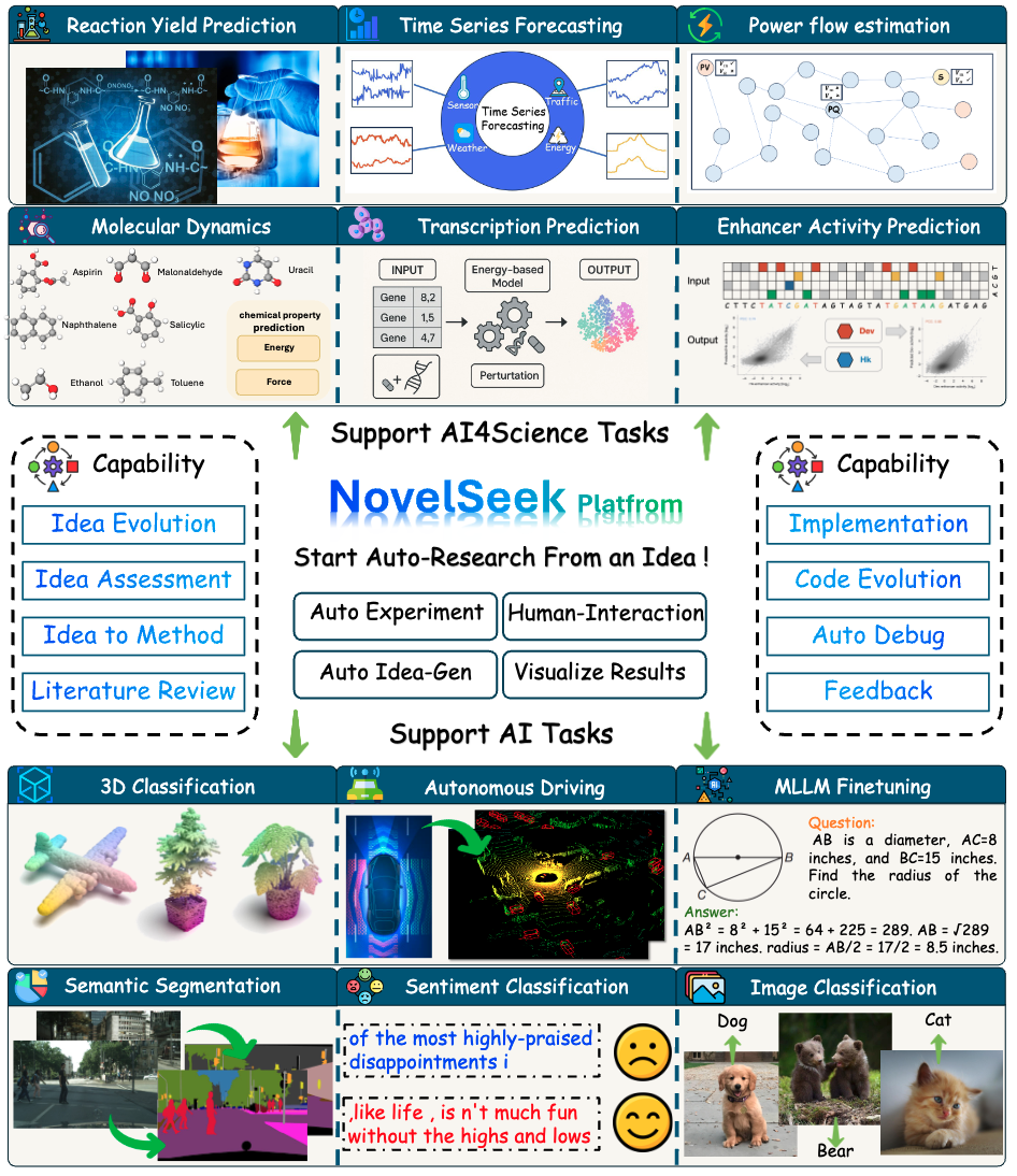 ์ด ๋ ผ๋ฌธ์ ์ธ๊ณต์ง๋ฅ(AI)์ด ๊ณผํ ์ฐ๊ตฌ ํจ๋ฌ๋ค์์ ๊ฐ์ํํ๊ณ ์์์ ๊ฐ์กฐํ๋ฉฐ, ๊ฐ์ค ์ค์ ๋ถํฐ ๊ฒ์ฆ๊น์ง ์์จ์ ์ธ ๊ณผํ ์ฐ๊ตฌ(ASR)๋ฅผ ์ํํ๋ ํตํฉ ํ์ ๋ฃจํ ๋ฉํฐ ์์ด์ ํธ ํ๋ ์์ํฌ NovelSeek์ ์๊ฐํ๋ค. NovelSeek์ ํ์ฅ์ฑ, ์ํธ์์ฉ์ฑ, ํจ์จ์ฑ์ด๋ผ๋ ์ธ ๊ฐ์ง ํต์ฌ ์ฅ์ ์ ๊ฐ๋๋ค. 12๊ฐ์ง ๊ณผํ ์ฐ๊ตฌ ์์ ์์ ํ์ ์ ์ธ ์์ด๋์ด๋ฅผ ์์ฑํ๊ณ , ์ธ๊ฐ ์ ๋ฌธ๊ฐ ํผ๋๋ฐฑ๊ณผ ๋ฉํฐ ์์ด์ ํธ ์ํธ์์ฉ์ ํตํด ๋๋ฉ์ธ ์ ๋ฌธ๊ฐ ์ง์ ํตํฉ์ ๊ฐ๋ฅํ๊ฒ ํ๋ค. ๋ํ, ์ธ๊ฐ์ ๋ ธ๋ ฅ์ ๋นํด ํจ์ฌ ์ ์ ์๊ฐ์ผ๋ก ์ฌ๋ฌ ๊ณผํ ๋ถ์ผ์์ ์ ๋งํ ์ฑ๋ฅ ํฅ์์ ๋ฌ์ฑํ์ฌ AI๊ฐ ๊ณผํ ์ฐ๊ตฌ ํจ์จ์ฑ์ ํฌ๊ฒ ๋์ผ ์ ์์์ ์ ์ฆํ๋ค.