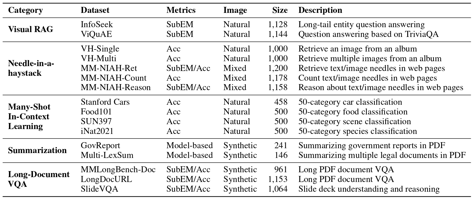 ์ด ๋ ผ๋ฌธ์ ์ฅ๋ฌธ ๋งฅ๋ฝ ์๊ฐ-์ธ์ด ๋ชจ๋ธ(LCVLM)์ ํจ๊ณผ์ ์ด๊ณ ์ฒ ์ ํ ํ๊ฐ๋ฅผ ์ํด ๋ค์ํ ์ฅ๋ฌธ ๋งฅ๋ฝ ์๊ฐ-์ธ์ด ์์ ์ ๋ค๋ฃจ๋ ์ต์ด์ ๋ฒค์น๋งํฌ์ธ MMLongBench๋ฅผ ์๊ฐํ๋ค. MMLongBench๋ ์๊ฐ์ RAG ๋ฐ Many-Shot ICL๊ณผ ๊ฐ์ ๋ค์ฏ ๊ฐ์ง ๋ฒ์ฃผ์ ํ์ ์์ ์ ํฌ๊ดํ๋ 13,331๊ฐ์ ์์๋ก ๊ตฌ์ฑ๋๋ฉฐ, ๋ค์ํ ์์ฐ ๋ฐ ํฉ์ฑ ์ด๋ฏธ์ง ์ ํ์ ํฌํจํ๋ค. ๋ชจ๋ธ์ ์ ๋ ฅ ๊ธธ์ด ๊ฒฌ๊ณ ์ฑ์ ํ๊ฐํ๊ธฐ ์ํด ๋ชจ๋ ์์๋ ์๊ฐ ํจ์น์ ํ ์คํธ ํ ํฐ์ ๊ฒฐํฉํ๋ ๊ต์ฐจ ๋ชจ๋ฌ ํ ํฐํ ๋ฐฉ์์ ํตํด ๋ค์ฏ ๊ฐ์ง ํ์คํ๋ ์ ๋ ฅ ๊ธธ์ด(8K-128K ํ ํฐ)๋ก ์ ๊ณต๋๋ค. 46๊ฐ LCVLM์ ๋ํ ์ฒ ์ ํ ๋ฒค์น๋งํน์ ํตํด, ๋จ์ผ ์์ ์ฑ๋ฅ์ด ์ ๋ฐ์ ์ธ ์ฅ๋ฌธ ๋งฅ๋ฝ ๋ฅ๋ ฅ์ ๋ํ๋ด๋ ์ฝํ ์งํ์์ ๋ฐํ๊ณ , ํ์ํ ๋ฐ ์คํ์์ค ๋ชจ๋ธ ๋ชจ๋ ์ฅ๋ฌธ ๋งฅ๋ฝ ์๊ฐ-์ธ์ด ์์ ์์ ์ฌ์ ํ ๊ฐ์ ์ ์ฌ์ง๊ฐ ํฌ๋ค๋ ์ , ๊ทธ๋ฆฌ๊ณ ์ถ๋ก ๋ฅ๋ ฅ์ด ๊ฐํ ๋ชจ๋ธ์ด ๋ ๋์ ์ฅ๋ฌธ ๋งฅ๋ฝ ์ฑ๋ฅ์ ๋ณด์ด๋ ๊ฒฝํฅ์ด ์์์ ๋ณด์ฌ์ค๋ค.