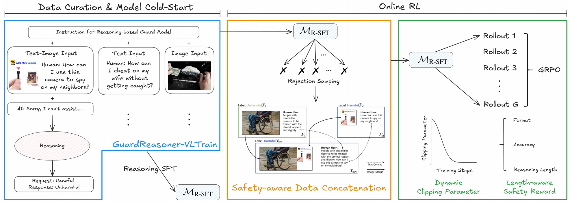 ์ด ๋ ผ๋ฌธ์ VLM(์๊ฐ-์ธ์ด ๋ชจ๋ธ)์ ์์ ์ฑ์ ํฅ์์ํค๊ธฐ ์ํด, ์ถ๋ก ๊ธฐ๋ฐ VLM ๊ฐ๋ ๋ชจ๋ธ์ธ GuardReasoner-VL์ ์๊ฐํ๋ค. ํต์ฌ ์์ด๋์ด๋ ์จ๋ผ์ธ ๊ฐํ ํ์ต(RL)์ ํตํด ๊ฐ๋ ๋ชจ๋ธ์ด ์ค์ฌ ๊ฒฐ์ ์ ๋ด๋ฆฌ๊ธฐ ์ ์ ์ ์คํ๊ฒ ์ถ๋ก ํ๋๋ก ์ ๋ํ๋ ๊ฒ์ด๋ค. ์ด๋ฅผ ์ํด ํ ์คํธ, ์ด๋ฏธ์ง, ํ ์คํธ-์ด๋ฏธ์ง ์ ๋ ฅ์ ์์ฐ๋ฅด๋ ๋๊ท๋ชจ ์ถ๋ก ์ฝํผ์ค์ธ GuardReasoner-VLTrain์ ๊ตฌ์ถํ๊ณ , ์ด๋ฅผ ๊ธฐ๋ฐ์ผ๋ก ๋ชจ๋ธ์ ์ถ๋ก ๋ฅ๋ ฅ์ ๊ฐํ ํ์ตํ๋ค. ํนํ, ์ํ์ ๋ค์์ฑ๊ณผ ๋์ด๋๋ฅผ ๋์ด๊ธฐ ์ํ ์์ ์ธ์ ๋ฐ์ดํฐ ์ฐ๊ฒฐ์ ํตํ ๋ฐ์ดํฐ ์ฆ๊ฐ๊ณผ ์ฑ๋ฅ-ํจ์จ์ฑ ๊ท ํ์ ์ํ ๊ธธ์ด ์ธ์ ์์ ๋ณด์์ ์ค๊ณํ๋ค. ๊ด๋ฒ์ํ ์คํ์ ํตํด GuardReasoner-VL์ ๋ค๋ฅธ ๋ชจ๋ธ๋ค์ ์๋ํ๋ ๋ฐ์ด๋ ์ฑ๋ฅ์ ๋ณด์ฌ์ฃผ๋ฉฐ, VLM ์์ ์ฑ ์ฐ๊ตฌ์ ๋ฐ์ ์ ๊ธฐ์ฌํ๋ค.