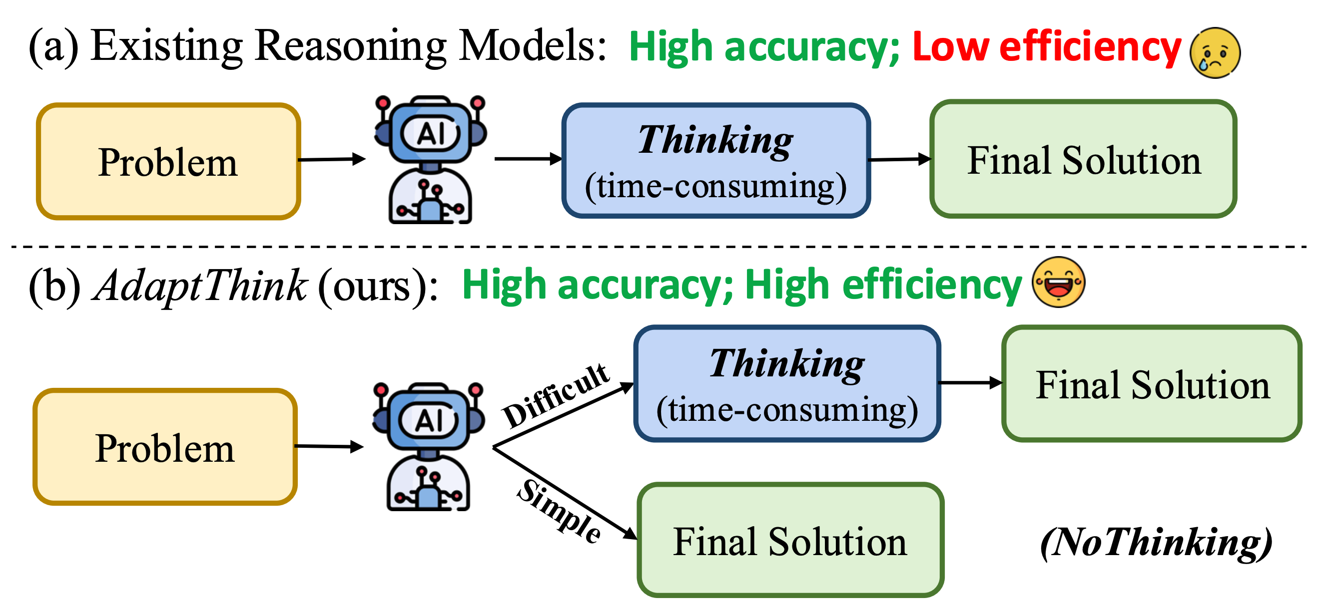 ์ด ์ฐ๊ตฌ๋ ๋๊ท๋ชจ ์ถ๋ก ๋ชจ๋ธ์ด ๋ณต์กํ ์ฌ๊ณ ๊ณผ์ ์ ํตํด ์ข์ ์ฑ๋ฅ์ ๋ด์ง๋ง, ์ด๋ก ์ธํด ๋ฐ์ํ๋ ๋์ ์ถ๋ก ๋น์ฉ ๋ฌธ์ ๋ฅผ ํด๊ฒฐํ๊ธฐ ์ํด AdaptThink๋ผ๋ ์๋ก์ด ๊ฐํ ํ์ต(RL) ์๊ณ ๋ฆฌ์ฆ์ ์ ์ํ๋ค. AdaptThink๋ ์ถ๋ก ๋ชจ๋ธ์ด ๋ฌธ์ ๋์ด๋์ ๋ฐ๋ผ '์ฌ๊ณ ๋ชจ๋'์ '๋น์ฌ๊ณ ๋ชจ๋' ์ค ์ต์ ์ ๋ชจ๋๋ฅผ ์ ์์ ์ผ๋ก ์ ํํ๋๋ก ๊ฐ๋ฅด์น๋ค. ํนํ, ๊ฐ๋จํ ์์ ์์๋ ์ฌ๊ณ ๊ณผ์ ์ ์๋ตํ๊ณ ์ง์ ๋ต์ ๋ด๋ 'NoThinking' ๋ฐฉ์์ด ์ฑ๋ฅ๊ณผ ํจ์จ์ฑ ๋ฉด์์ ๋ ๋์ ์ ํ์์ ๋ฐํ๊ณ , ์ด๋ฅผ ๋ฐํ์ผ๋ก ๋ชจ๋ธ์ด ์ ์ฒด ์ฑ๋ฅ์ ์ ์งํ๋ฉด์ 'NoThinking'์ ์ ํํ๋๋ก ์ ๋ํ๋ ์ ์ฝ ์กฐ๊ฑด๋ถ ์ต์ ํ ๋ชฉํ์ ํ์ต ์ค ๋ ๊ฐ์ง ์ฌ๊ณ ๋ชจ๋ ์ํ์ ๊ท ํ์ ๋ง์ถ๋ ์ค์๋ ์ํ๋ง ์ ๋ต์ ํต์ฌ ๊ตฌ์ฑ ์์๋ก ์ฌ์ฉํ๋ค. ์คํ ๊ฒฐ๊ณผ, AdaptThink๋ ์ถ๋ก ๋น์ฉ์ ํฌ๊ฒ ์ค์ด๋ฉด์๋ ์ฑ๋ฅ์ ํฅ์์ํค๋ ํจ๊ณผ์ ์ธ ๋ฐฉ๋ฒ์ ์ ์ํ๋ค.