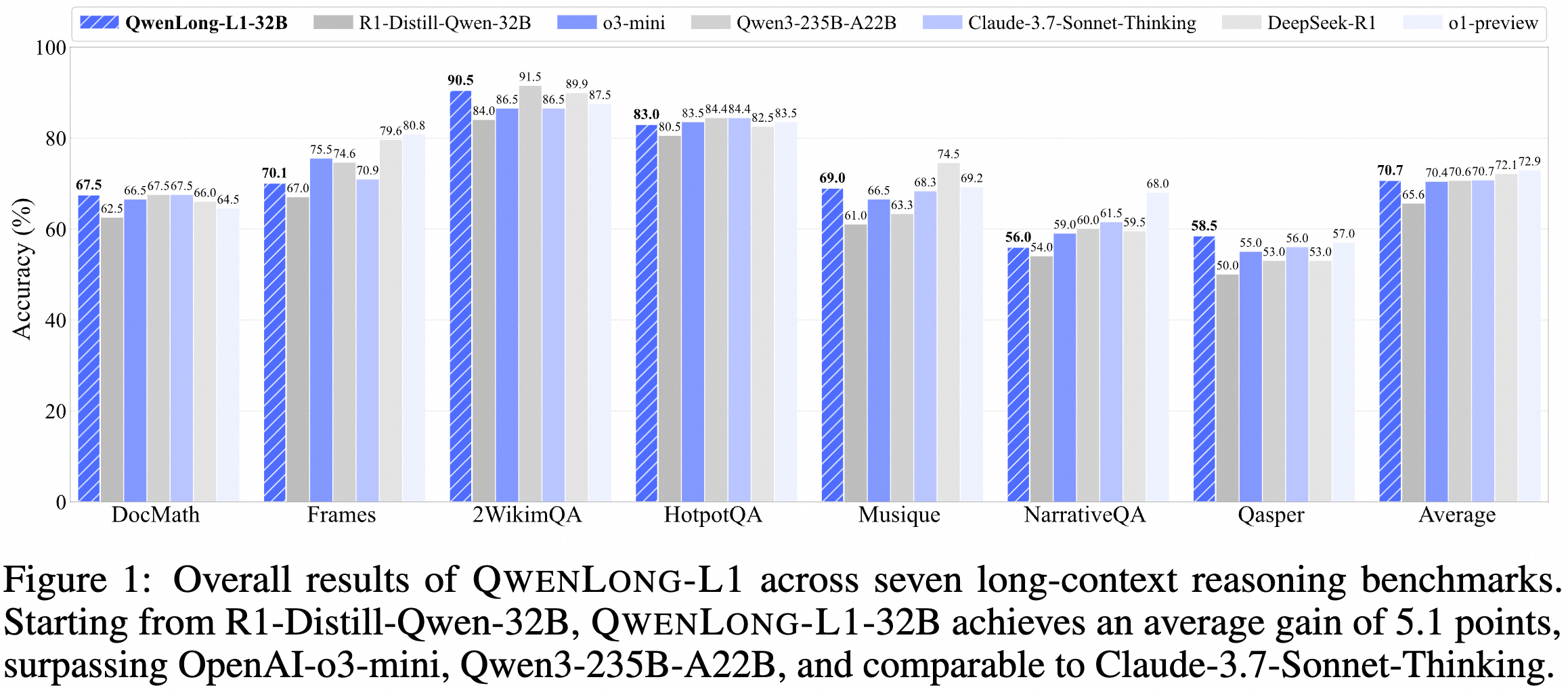 ํ์์ ์ฅ๋ คํ๊ธฐ ์ํ ๋์ด๋ ์ธ์ ํ๊ณ ์ ์ํ๋ง ์ ๋ต์ผ๋ก ๊ฐํํ๋ค. 7๊ฐ์ ์ฅ๋ฌธ ๋ฌธ์ ์ง์์๋ต ๋ฒค์น๋งํฌ ์คํ์์ QwenLong-L1-32B๋ OpenAI-o3-mini ๋ฐ Qwen3-235B-A22B์ ๊ฐ์ ๋ํ์ ์ธ LRM์ ๋ฅ๊ฐํ๊ณ Claude-3.7-Sonnet-Thinking๊ณผ ๋๋ฑํ ์ฑ๋ฅ์ ๋ฌ์ฑํ์ฌ ์ต์ฒจ๋จ LRM ์ค ์ต๊ณ ์ ์ฑ๋ฅ์ ๋ณด์ฌ์ค๋ค.