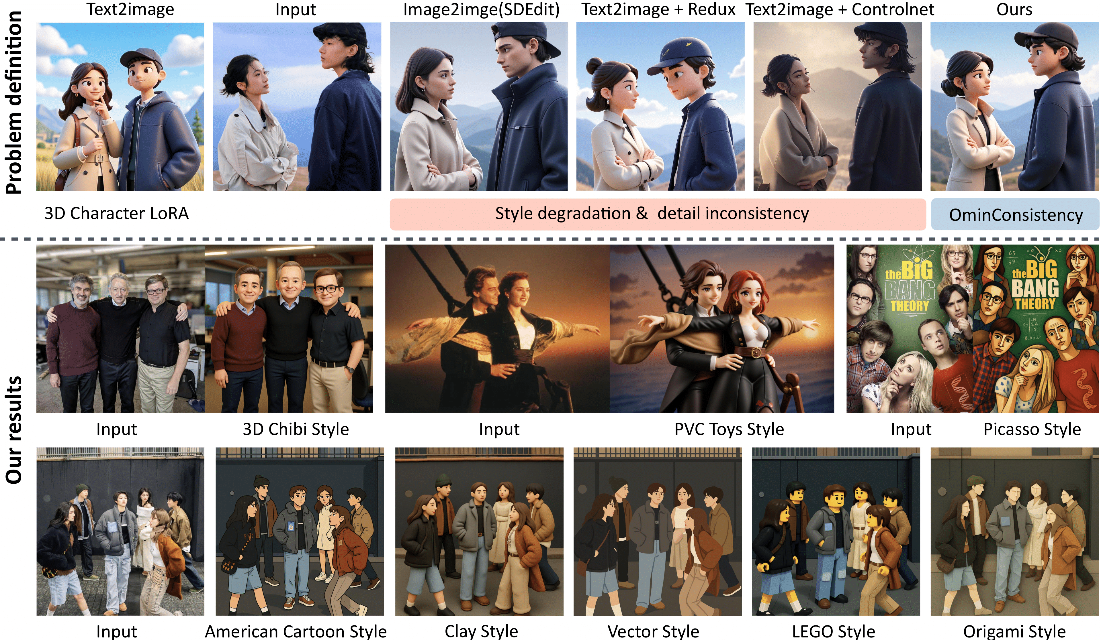 ผ๋ฌธ์ ๋๊ท๋ชจ ํ์ฐ ํธ๋์คํฌ๋จธ(DiT)๋ฅผ ํ์ฉํ๋ ๋ณดํธ์ ์ธ ์ผ๊ด์ฑ ํ๋ฌ๊ทธ์ธ์ธ OmniConsistency๋ฅผ ์ ์ํ๋ค. OmniConsistency๋ ๋ค์์ ๊ธฐ์ฌํ๋ค: (1) ๊ฐ๋ ฅํ ์ผ๋ฐํ๋ฅผ ์ํด ์ ๋ ฌ๋ ์ด๋ฏธ์ง ์์ ๋ํด ํ๋ จ๋ ์ปจํ