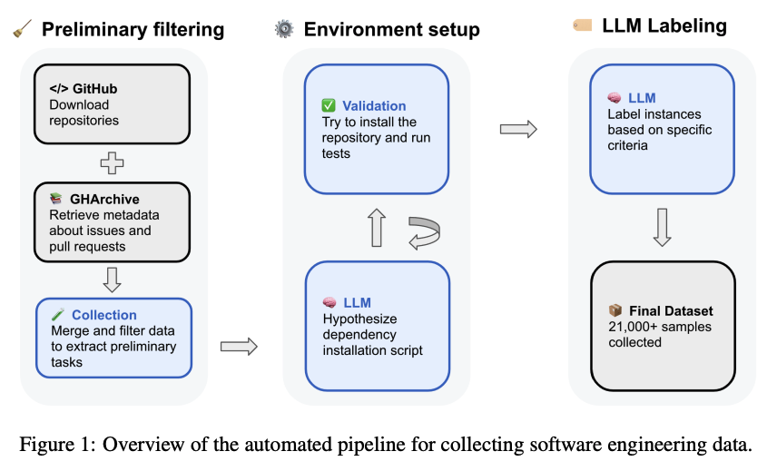์ ์ง์์ ์ผ๋ก ์ถ์ถํ๋ ์๋กญ๊ณ ์๋ํ๋์์ผ๋ฉฐ ํ์ฅ ๊ฐ๋ฅํ ํ์ดํ๋ผ์ธ์ ์๊ฐํ๋ค. ์ด ํ์ดํ๋ผ์ธ์ ์ฌ์ฉํ์ฌ ๋๊ท๋ชจ SWE ์์ด์ ํธ์ ๊ฐํ ํ์ต์ ์ ํฉํ 21,000๊ฐ ์ด์์ ๋ํํ Python ๊ธฐ๋ฐ SWE ์์