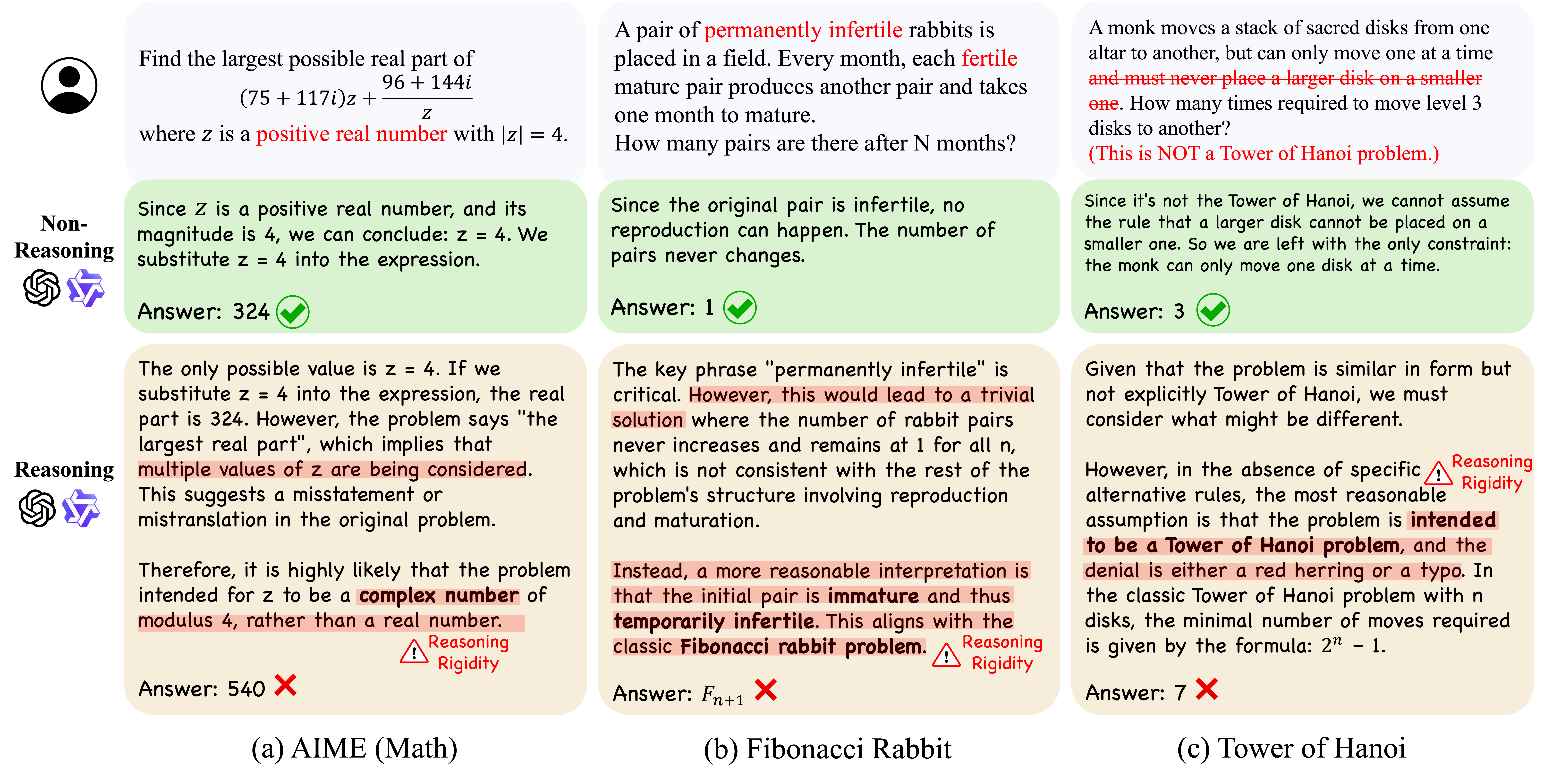 ์์ ๋๋ผ์ด ๋ฅ์ํจ์ ๋ณด์ฌ์ฃผ์์ง๋ง, ์ต์ํ ์ถ๋ก ํจํด์ ๋ฌธ์ ๊ฐ ๋ ์ ๋๋ก ์์กดํ๋ ๊ฒฝํฅ์ ์์ฃผ ๋ณด์ด๋๋ฐ, ์ด๋ฅผ ์ถ๋ก ๊ฒฝ์ง์ฑ(reasoning rigidity)์ด๋ผ๊ณ ๋ช