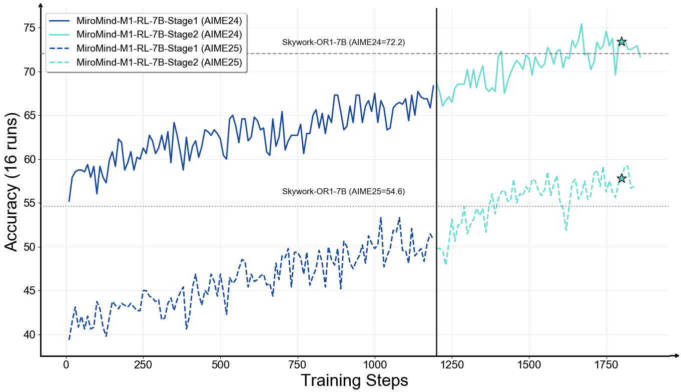 MiroMind-M1์ ์ํ์ ์ถ๋ก ์ ํนํ๋ ์์ ์คํ์์ค ์ถ๋ก ์ธ์ด ๋ชจ๋ธ๋ก, ๊ธฐ์กด ์คํ์์ค ๋ชจ๋ธ๋ค์ด ๋ฐ์ดํฐ์