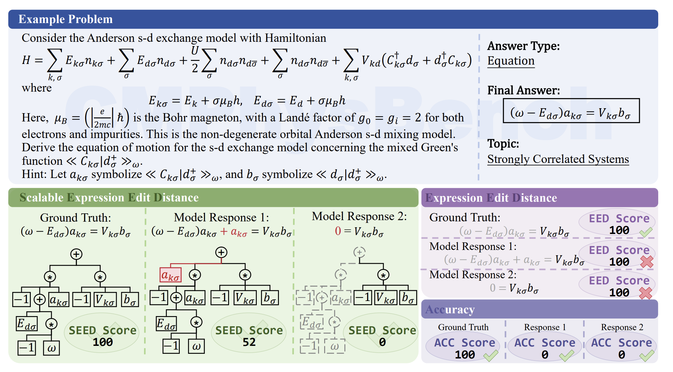 CMPhysBench๋ ์์ง๋ฌผ์ง๋ฌผ๋ฆฌํ์ด๋ผ๋ ๊ณ ๋๋ก ์ ๋ฌธํ๋ ๊ณผํ ๋ถ์ผ์์ LLM์ ๋ฌธ์ ํด๊ฒฐ ๋ฅ๋ ฅ์ ์ ๋ฐํ๊ฒ ํ๊ฐํ๊ธฐ ์ํด ์ค๊ณ๋ ์๋ก์ด ๋ฒค์น๋งํฌ์ด๋ค. 520๊ฐ ์ด์์ ๋ํ์ ์์ค ๊ณ์ฐ ๋ฌธ์ ๋ก ๊ตฌ์ฑ๋์ด ์์ผ๋ฉฐ, ์ ๋ต ์ฌ๋ถ๋ง ํ๋จํ๋ ๋์ ํ์ด ๊ณผ์ ์ ์์ ์ ์ฌ๋๊น์ง ์ธก์ ํ๋ SEED ์ ์ ์ฒด๊ณ๋ฅผ ๋์