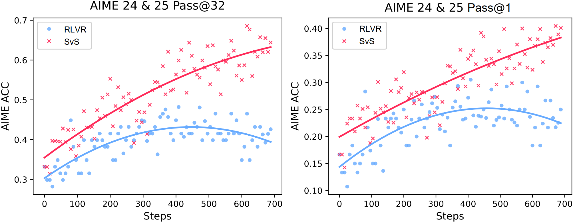 ผ๋ฌธ์ ๊ฒ์ฆ ๊ฐ๋ฅํ ๋ณด์ ๊ธฐ๋ฐ ๊ฐํํ์ต(RLVR)์ ๊ณ ์ง์ ๋ฌธ์ ์ธ ์์ฑ ๋ค์์ฑ ๊ฐ์๋ฅผ ํด๊ฒฐํ๊ธฐ ์ํด ๋ณํ ๋ฌธ์ ํฉ์ฑ์ ํตํ ์๊ธฐ-๋๊ตญ(SvS) ์ ๋ต์ ์ ์ํ๋ค. ์ด ๋ฐฉ๋ฒ์ ๋ชจ๋ธ์ด ์ค์ค๋ก ์์ฑํ ์ ๋ต์ ํ์ฉํ์ฌ ์ ๋ต์ ๊ฐ์ง๋ง ํํ๊ฐ ๋ค๋ฅธ ์๋ก์ด ๋ฌธ์ ๋ฅผ ์จ๋ผ์ธ์ผ๋ก ํฉ์ฑํ์ฌ ํ๋ จ์ ์ฌ์ฉํ๋ค. ๊ฒฐ๊ณผ์ ์ผ๋ก, ๋ชจ๋ธ์ด ๋จ์ผ ์ ๋ต ๊ฒฝ๋ก์ ๊ณผ์ ํฉ๋๋ ๊ฒ์ ๋ฐฉ์งํ๊ณ ์์ฑ ๋ค์์ฑ์ ์ ์งํ์ฌ ์ฌ๋ฌ ๋ต์ ํ์ํ๋ ๋ฅ๋ ฅ(Pass@k)์ ํฌ๊ฒ ํฅ์์ํค๋ ๋ฐ ์ฑ๊ณตํ๋ค.