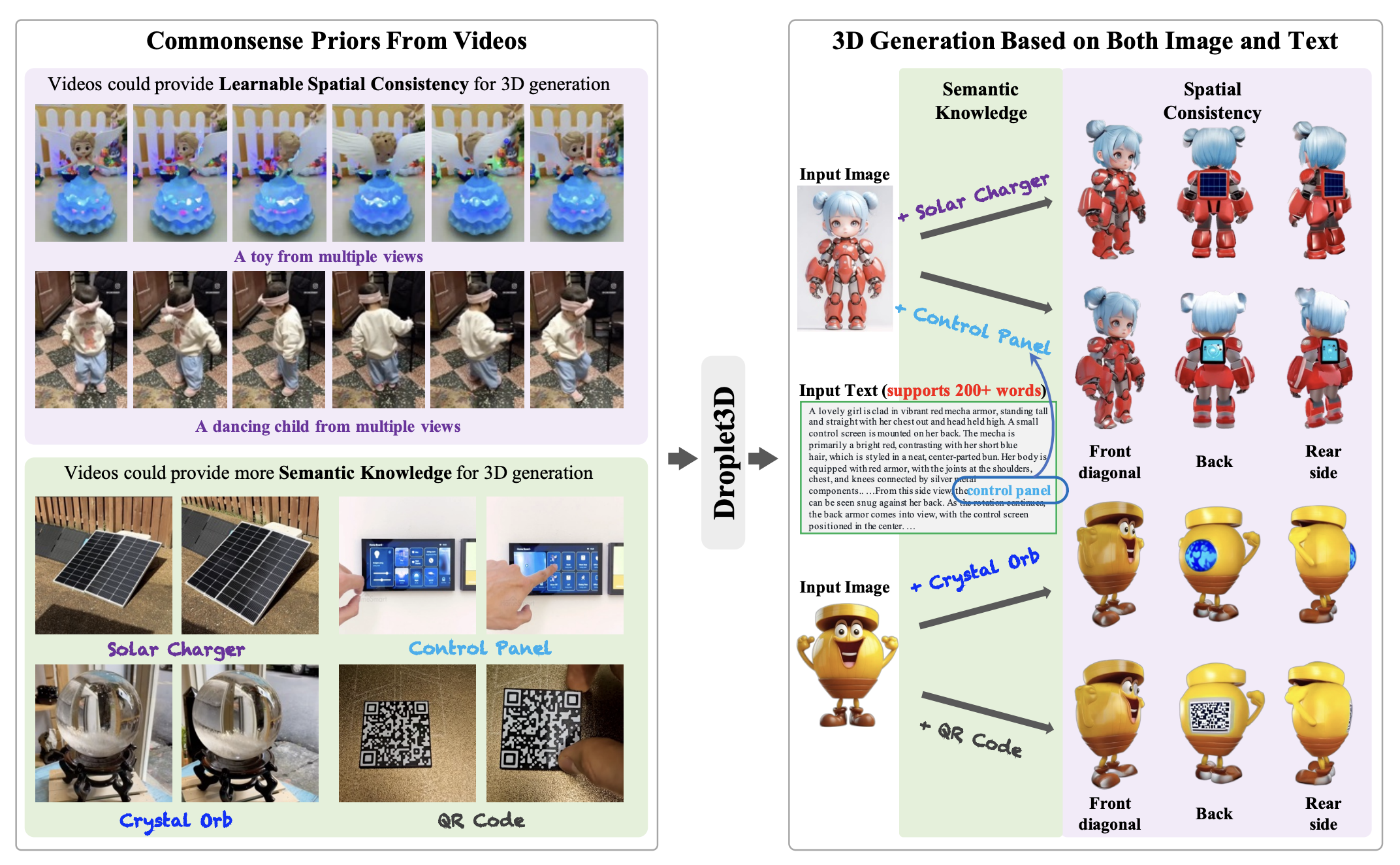 Droplet3D๋ 3D ๋ฐ์ดํฐ ๋ถ์กฑ ๋ฌธ์ ๋ฅผ ํด๊ฒฐํ๊ธฐ ์ํด ์ธํฐ๋ท์ ํ๋ถํ ๋์์์์ ์์์ ์ฌ์ ์ง์(commonsense priors)์ ์ถ์ถํ์ฌ 3D ์ฝํ