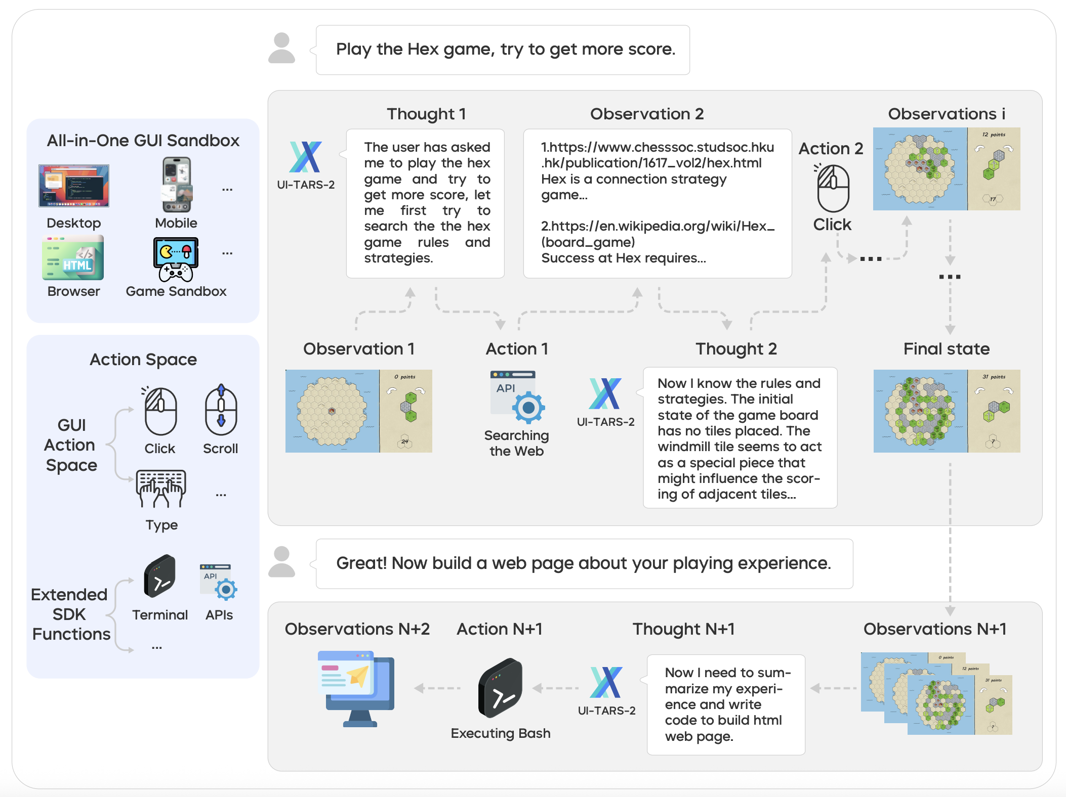 ผ๋ฌธ์ ๊ทธ๋ํฝ ์ฌ์ฉ์ ์ธํฐํ์ด์ค(GUI)๋ฅผ ์์จ์ ์ผ๋ก ์กฐ์ํ๋ ์์ด์ ํธ ๋ชจ๋ธ UI-TARS-2์ ๊ฐ๋ฐ ๊ณผ์ ๊ณผ ์ฑ๊ณผ๋ฅผ ์์ธํ ๊ธฐ์ ํ ๋ณด๊ณ ์์ด๋ค. ์ด ๋ชจ๋ธ์ ๋ฐ์ดํฐ ํ์ฅ์ฑ, ์์ ์ ์ธ ๋ค์ค ํด ๊ฐํํ์ต, GUI ์ธ๋ถ ํ๊ฒฝ๊ณผ์ ์ฐ๋ ๋ฑ ๊ธฐ์กด GUI ์์ด์ ํธ์ ์ฃผ์ ๋์ ๋ค์ ์ฒด๊ณ์ ์ธ ํ๋ จ ๋ฐฉ๋ฒ๋ก ์ผ๋ก ํด๊ฒฐํ๋ค. ๊ทธ ๊ฒฐ๊ณผ Mind2Web, OSWorld ๋ฑ ์ฃผ์ ๋ฒค์น๋งํฌ์์ ๊ธฐ์กด์ ๊ฐ๋ ฅํ ๋ชจ๋ธ๋ค์ ๋ฅ๊ฐํ๋ ์ต๊ณ ์์ค์ ์ฑ๋ฅ์ ๋ฌ์ฑํ์ผ๋ฉฐ, ๊ฒ์ ๋ฐ ์ํํธ์จ์ด ์์ง๋์ด๋ง ๋ฑ ๋ค์ํ ์์