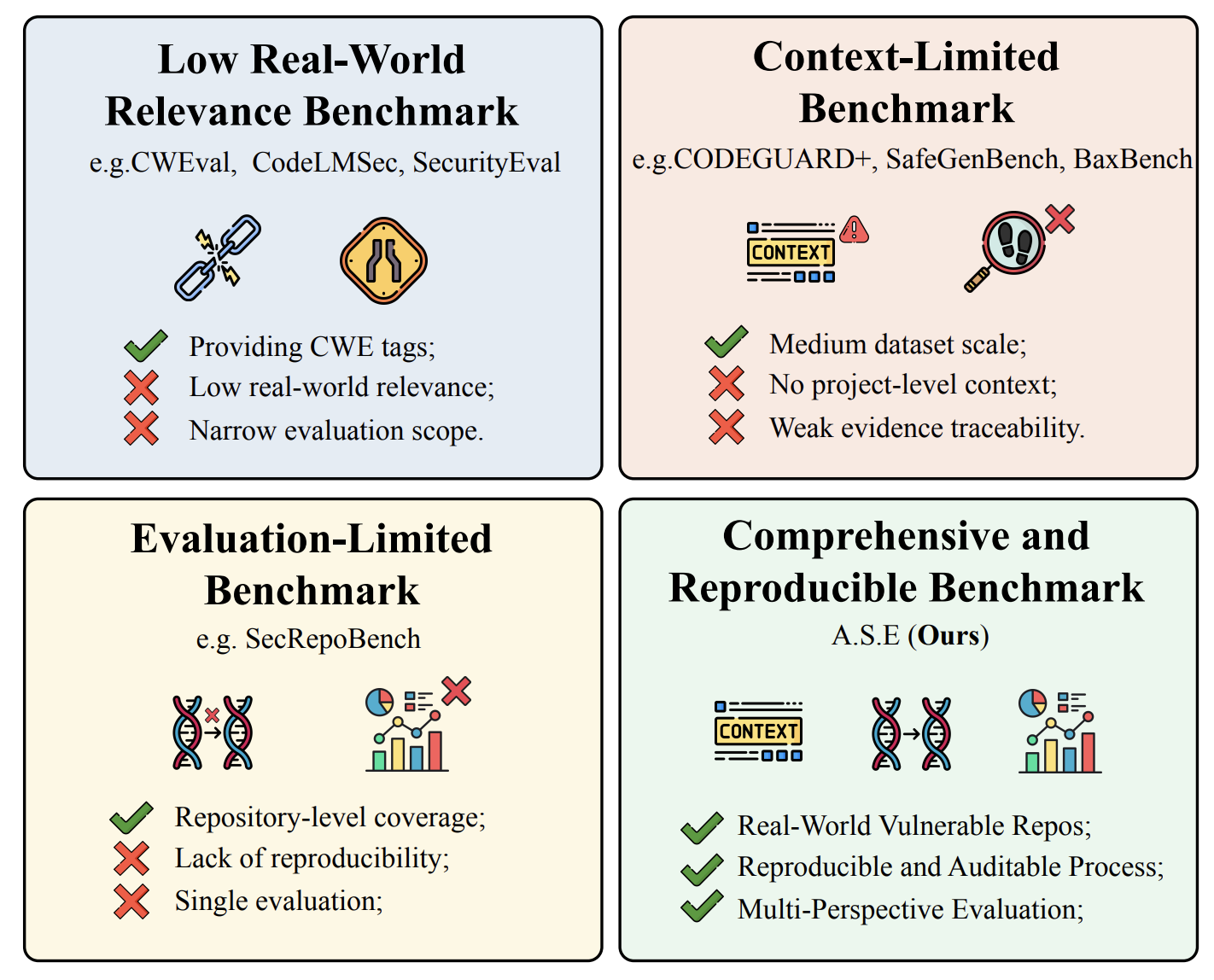 A.S.E๋ AI๊ฐ ์์ฑํ ์ฝ๋์ ๋ณด์์ฑ์ ๋ณด๋ค ํ์ค์ ์ผ๋ก ํ๊ฐํ๊ธฐ ์ํ ์๋ก์ด ๋ฒค์น๋งํฌ A.S.E๋ฅผ ์ ์ํ๋ค. ๊ธฐ์กด ๋ฒค์น๋งํฌ๋ค์ด ๋จํธ์ ์ธ ์ฝ๋ ์กฐ๊ฐ๋ง ๋ณด๊ฑฐ๋ ์ฌํ์ฑ์ด ๋จ์ด์ง๋ ํ๊ณ๋ฅผ ๊ฐ์ก๋ ๋ฌธ์ ๋ฅผ ํด๊ฒฐํ๊ธฐ ์ํด, ์ด ๋ฒค์น๋งํฌ๋ ์ค์ ๋ณด์ ์ทจ์ฝ์ (CVE)์ด ์์๋ ์ ์ฒด ์ฝ๋ ์ ์ฅ์(repository)๋ฅผ ๊ธฐ๋ฐ์ผ๋ก ํ์ฌ ํ๋ก์ ํธ์ ์์ ํ ๋งฅ๋ฝ ์์์ ํ๊ฐ๋ฅผ ์ํํ๋ค. ์ปจํ