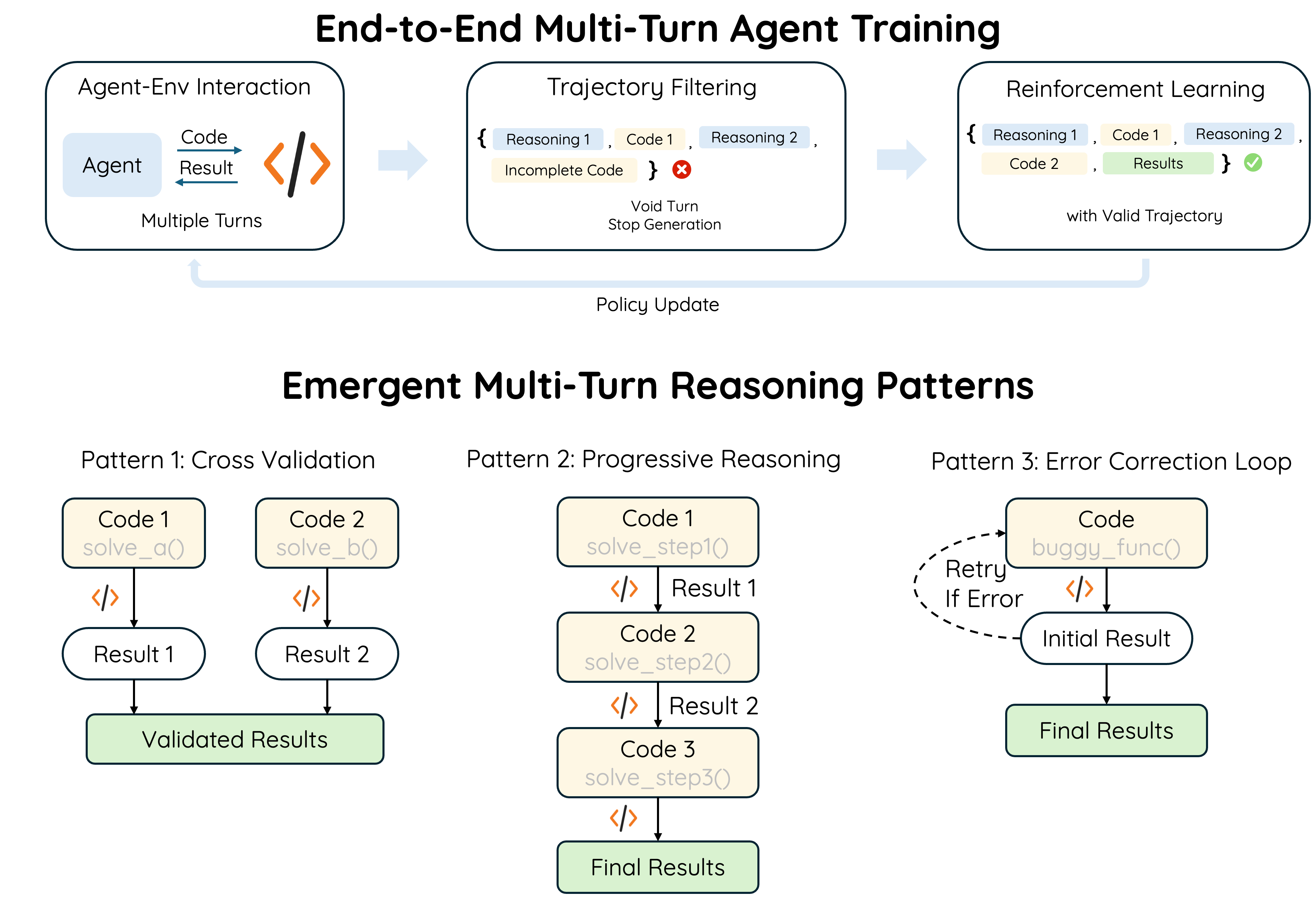 SimpleTIR์ LLM์ด ์ฌ๋ฌ ํด์ ๊ฑธ์ณ ์ธ๋ถ ๋๊ตฌ๋ฅผ ์ฌ์ฉํ๋ ์ถ๋ก ์ ๊ฐํํ์ต์ผ๋ก ์์ ์ ์ผ๋ก ํ๋ จ์ํค๋ ์๊ณ ๋ฆฌ์ฆ์ด๋ค. ๋ค์ค ํด ๋๊ตฌ ์ฌ์ฉ ํ๋ จ ์, ์ ํจํ ๊ฒฐ๊ณผ๋ฅผ ๋ด์ง ๋ชปํ๋ '๋ฌดํจ ํด(void turns)'์ด ํ์ต ๋ถ์์ ์ฑ๊ณผ ์ฑ๋ฅ ๋ถ๊ดด๋ฅผ ์ผ์ผํค๋ ํต์ฌ ์์ธ์์ ๋ฐ๊ฒฌํ๋ค. SimpleTIR์ ์ด๋ฌํ ๋ฌธ์ ๊ฐ ์๋ ํด์ด ํฌํจ๋ ํ์ต ๋ฐ์ดํฐ๋ฅผ ์ ์ฑ