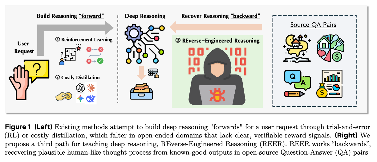 ์์ ์ธ์ด ๋ชจ๋ธ์ ์ถ๋ก ๋ฅ๋ ฅ์ ๊ฐํํ๋ REER(REverse-Engineered Reasoning)์ด๋ผ๋ ์๋ก์ด ํจ๋ฌ๋ค์์ ์ ์ํ๋ค. ๊ธฐ์กด์ ๊ฐํ ํ์ต์ด๋ ์ง์ ์ฆ๋ฅ ๋ฐฉ์์ด ์๊ณ ์๋ ๋ช