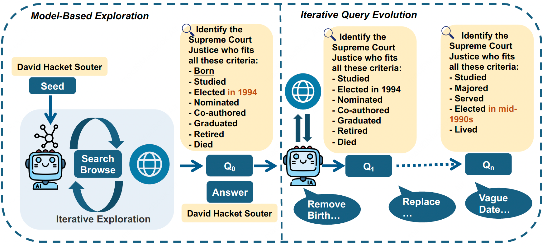 ผ๋ฌธ์ ์๋ก์ด ๋ฐ์ดํฐ ์์ฑ ์ ๊ทผ๋ฒ์ ์ ์ํ๋ค. WebExplorer๋ '๋ชจ๋ธ ๊ธฐ๋ฐ ํ์'๊ณผ '์ฅ๊ธฐ-๋จ๊ธฐ ์ง์ ์งํ' ๋ฐฉ์์ ํตํด ๋ค๋จ๊ณ ์ถ๋ก ๊ณผ ๋ณต์กํ ์น ํ์์ด ํ์ํ ๊ณ ํ์ง์ ์ฟผ๋ฆฌ-์๋ต ์์ ์ฒด๊ณ์ ์ผ๋ก ์์ฑํ๋ค. ์ด ๋ฐ์ดํฐ๋ก ํ๋ จ๋ WebExplorer-8B ๋ชจ๋ธ์ 128K์ ์ปจํ