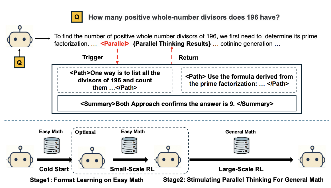 ผ๋ฌธ์ ๋ณต์กํ ์ถ๋ก ๋ฌธ์ ํด๊ฒฐ์ ์ํด ์ธ์ด ๋ชจ๋ธ์ ๋ณ๋ ฌ์ ์ฌ๊ณ ๋ฅ๋ ฅ์ ๋ถ์ฌํ๋ ์ต์ด์ ๊ฐํ ํ์ต ํ๋ ์์ํฌ์ธ Parallel-R1์ ์๊ฐํ๋ค. ๊ธฐ์กด์ ์ง๋ ํ์ต ๋ฐฉ์์ด ๊ต์ฌ์ ๋ต๋ณ์ ๋จ์ํ ๋ชจ๋ฐฉํ๋ ๋ฐ ๊ทธ์น๋ ํ๊ณ๋ฅผ ์ง์ ํ๋ฉฐ, Parallel-R1์ ์ ์ง์ ์ปค๋ฆฌํ๋ผ์ ํ์ฉํด ๋ชจ๋ธ์ด ์ฌ๋ฌ ์ถ๋ก ๊ฒฝ๋ก๋ฅผ ๋์์ ํ์ํ๋๋ก ํ๋ จํ๋ค. ๋จผ์ ์ง๋ ํ์ต์ผ๋ก ๋ณ๋ ฌ์ ์ฌ๊ณ ์ ๊ธฐ์ด๋ฅผ ๋ค์ง ํ, ๊ฐํ ํ์ต์ ํตํด ์ด๋ ค์ด ๋ฌธ์ ์ ๋ํ ํ์ ๋ฐ ์ผ๋ฐํ ๋ฅ๋ ฅ์ ํค์ด๋ค. ์ด ๋ฐฉ์์ ์์ฐจ์ ์ฌ๊ณ ๋ชจ๋ธ ๋๋น 8.4%์ ์ ํ๋ ํฅ์์ ๊ฐ์ ธ์์ผ๋ฉฐ, ํนํ ์ค๊ฐ ํ๋ จ ๋จ๊ณ์์ ๋ณ๋ ฌ์ ์ฌ๊ณ ๋ฅผ 'ํ์ ๋๊ตฌ'๋ก ํ์ฉํจ์ผ๋ก์จ ์ต์ข