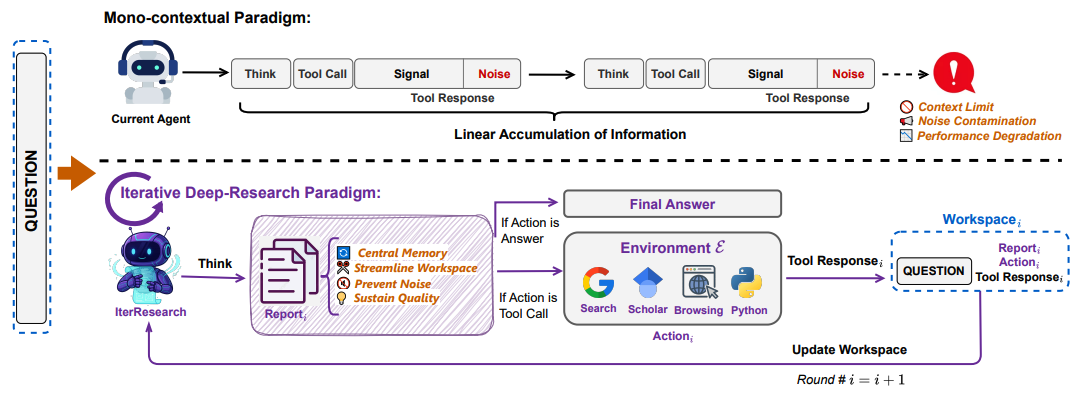 ์ฅ๊ธฐ์ ์ธ ์ฌ์ธต ์ฐ๊ตฌ๋ฅผ ์ํํ๋ AI ์์ด์ ํธ๋ ๋จ์ผ ๋ฌธ๋งฅ ์์์ ๋๋ฌด ๋ง์ ์ ๋ณด๋ฅผ ์ฒ๋ฆฌํ๋ค ๋ด์ฉ์ ํต์ฌ์ ๋์น๋ '๋ฌธ๋งฅ ์ง์' ๋ฌธ์ ๋ฅผ ๊ฒช์ด์๋ค. 'WebResearcher'๋ ์ฐ๊ตฌ ๊ณผ์ ์ ์ฌ๋ฌ ๋จ๊ณ๋ก ๋๋์ด ์ฃผ๊ธฐ์ ์ผ๋ก ์ค๊ฐ ๊ฒฐ๊ณผ๋ฅผ ์ ๋ฆฌํ๊ณ ๋ค์ ์ง์คํ๋ ๋ฐ๋ณต์ ํจ๋ฌ๋ค์์ ๋์