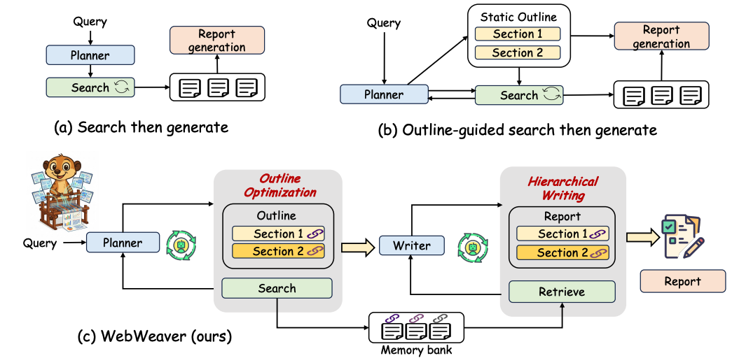 ๊ธฐ์กด AI๋ ์น์ ๋ฐฉ๋ํ ์ ๋ณด๋ก ์ฌ์ธต ๋ณด๊ณ ์๋ฅผ ์์ฑํ ๋, ๊ณ ์ ๋ ๊ณํ์ผ๋ก ๊ธด ๊ธ์ ํ ๋ฒ์ ์์ฑํ๋ ค๋ค ๋ณด๋ ๋ด์ฉ์ด ๋ถ์คํด์ง๋ ๋ฌธ์ ๊ฐ ์์๋ค. ์ด๋ฅผ ํด๊ฒฐํ๊ธฐ ์ํด ์ธ๊ฐ์ ์ฐ๊ตฌ ๊ณผ์ ์ฒ๋ผ ๋์ ์ผ๋ก ๊ณํ์ ์์ ํ๋ 'WebWeaver' ํ๋ ์์ํฌ๋ฅผ ๊ฐ๋ฐํ๋ค. WebWeaver๋ ์ ๋ณด๋ฅผ ์์งํ๋ฉฐ ๋ณด๊ณ ์ ๊ฐ์๋ฅผ ๋ฐ๋ณต์ ์ผ๋ก ์ต์ ํํ๋ 'ํ๋๋'์, ์ด ๊ฐ์์ ๋ฐ๋ผ ํ์ํ ๋ถ๋ถ๋ง ์ง์ค์ ์ผ๋ก ์์ฑํ๋ '๋ผ์ดํฐ'๋ก ๊ตฌ์ฑ๋๋ฉฐ, ์ด ์ ๊ทผ๋ฒ์ ํตํด ์ฌ๋ฌ ๋ฒค์น๋งํฌ์์ ์ต๊ณ ์ฑ๋ฅ์ ๋ฌ์ฑํ๋ฉฐ ์ ์ํ ๊ณํ์ ์ค์์ฑ์ ์