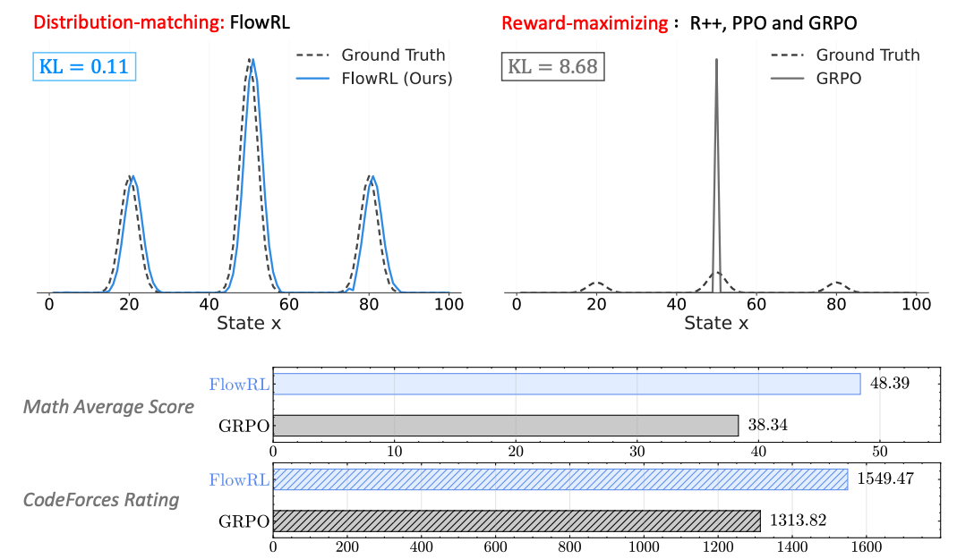 ๊ธฐ์กด์ ์ธ์ด ๋ชจ๋ธ ๊ฐํํ์ต์ ๊ฐ์ฅ ๋์ ๋ณด์๋ง ์ข๋ค ๋ณด๋, ๋ ์ผ๋ฐ์ ์ด์ง๋ง ์ ํจํ ์ถ๋ก ๊ฒฝ๋ก๋ฅผ ๋์ณ ๋ชจ๋ธ์ ๋ค์์ฑ์ ํด์น๋ ๋ฌธ์ ๊ฐ ์์๋ค. 'FlowRL'์ ์ด๋ฌํ ๋ฌธ์ ๋ฅผ ํด๊ฒฐํ๊ธฐ ์ํด ๋จ์ผ ๋ณด์ ๊ทน๋ํ ๋์ ์ ์ฒด '๋ณด์ ๋ถํฌ'๋ฅผ ํ์ต ๋ชฉํ๋ก ์ผ์๋ค. ์ฆ, ๋ค์ํ ์ ๋ต ๊ฒฝ๋ก๋ฅผ ๊ณจ๊ณ ๋ฃจ ๋ฐฐ์ฐ๋๋ก ์ ๋ํ ๊ฒฐ๊ณผ, ์ํ ๋ฐ ์ฝ๋ ์ถ๋ก ๋ฌธ์ ์์ ๊ธฐ์กด ๋ฐฉ์๋ณด๋ค ์๋ฑํ ๋์ ์ฑ๋ฅ์ ๋ฌ์ฑํ๋ฉฐ ํจ์จ์ ์ธ ํ์๊ณผ ์ถ๋ก ๋ฅ๋ ฅ ํฅ์์ ์ด๋์ด๋๋ค.