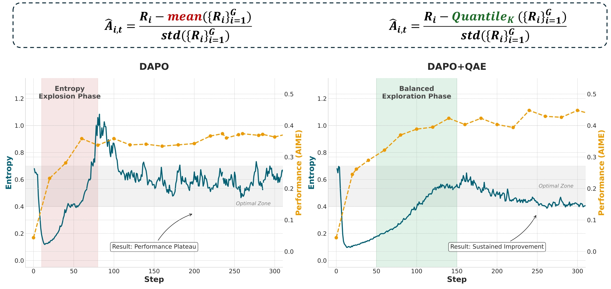 'Quantile Advantage Estimation(QAE)'์ ๊ฐํํ์ต(RLVR)์ผ๋ก LLM์ ์ถ๋ก ๋ฅ๋ ฅ์ ํ๋ จํ ๋ ๋ฐ์ํ๋ '์ํธ๋กํผ ๋ถ๊ดด'์ 'ํญ๋ฐ' ํ์์ผ๋ก ์ธํ ํ์ต ๋ถ์์ ์ฑ ๋ฌธ์ ๋ฅผ ํด๊ฒฐํ๋ ๊ธฐ์ ์ด๋ค. ๊ธฐ์กด์ ํ๊ท ๊ธฐ๋ฐ ํ๊ฐ ๋ฐฉ์์ด ์๋ K-๋ถ์์๋ฅผ ๊ธฐ์ค์ผ๋ก ๋ต๋ณ์ ๊ฐ์น๋ฅผ ํ๊ฐํจ์ผ๋ก์จ, ์ด๋ ค์ด ๋ฌธ์ ์ ๋ํ ๋๋ฌธ ์ฑ๊ณต ์ฌ๋ก๋ ๊ฐํํ๊ณ ์ฌ์ด ๋ฌธ์ ์ ์คํจ ์ฌ๋ก์ ์ง์คํ๋ ํจ์จ์ ์ธ ํ์ต์ ์ ๋ํ๋ค. ์ด ๊ฐ๋จํ์ง๋ง ํต์ฌ์ ์ธ ๋ณ๊ฒฝ์ ํตํด ํ์ต ๊ณผ์ ์ ์ํธ๋กํผ๋ฅผ ์์ ์ํค๊ณ , ์ํ ์ถ๋ก ๋ฒค์น๋งํฌ์์ ์ง์์ ์ธ ์ฑ๋ฅ ํฅ์์ ์ด๋์ด๋ด๋ ๋ฐ ์ฑ๊ณตํ๋ค.