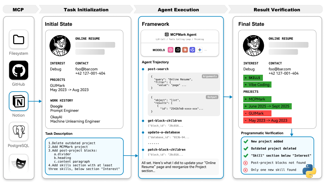 ๋ฌด ์ฒ๋ฆฌ ๋ฅ๋ ฅ์ ์ฌ๋ ์๊ฒ ํ๊ฐํ๋ ์๋ก์ด ๊ธฐ์ค์ ์ ์ํ๋ค. ์ด ๋ฒค์น๋งํฌ๋ ๋จ์ ์ ๋ณด ์กฐํ๋ฅผ ๋์ด ์์ฑ, ์์ , ์ญ์ (CRUD)๋ฅผ ํฌํจํ๋ ๋ณตํฉ์ ์ธ ๊ณผ์ ๋ค๋ก ๊ตฌ์ฑ๋์ด ์์ผ๋ฉฐ, gpt-5-medium๊ณผ ๊ฐ์ ์ต์ ๋ชจ๋ธ์กฐ์ฐจ 50%๋์ ๋ฎ์ ์ฑ๊ณต๋ฅ ์ ๊ธฐ๋กํ ๋งํผ ๋์ด๋๊ฐ ๋๋ค. ์ด๋ฅผ ํตํด MCPMark๋ ํ์ฌ LLM ์์ด์ ํธ๊ฐ ๊ฐ์ง ๋ช