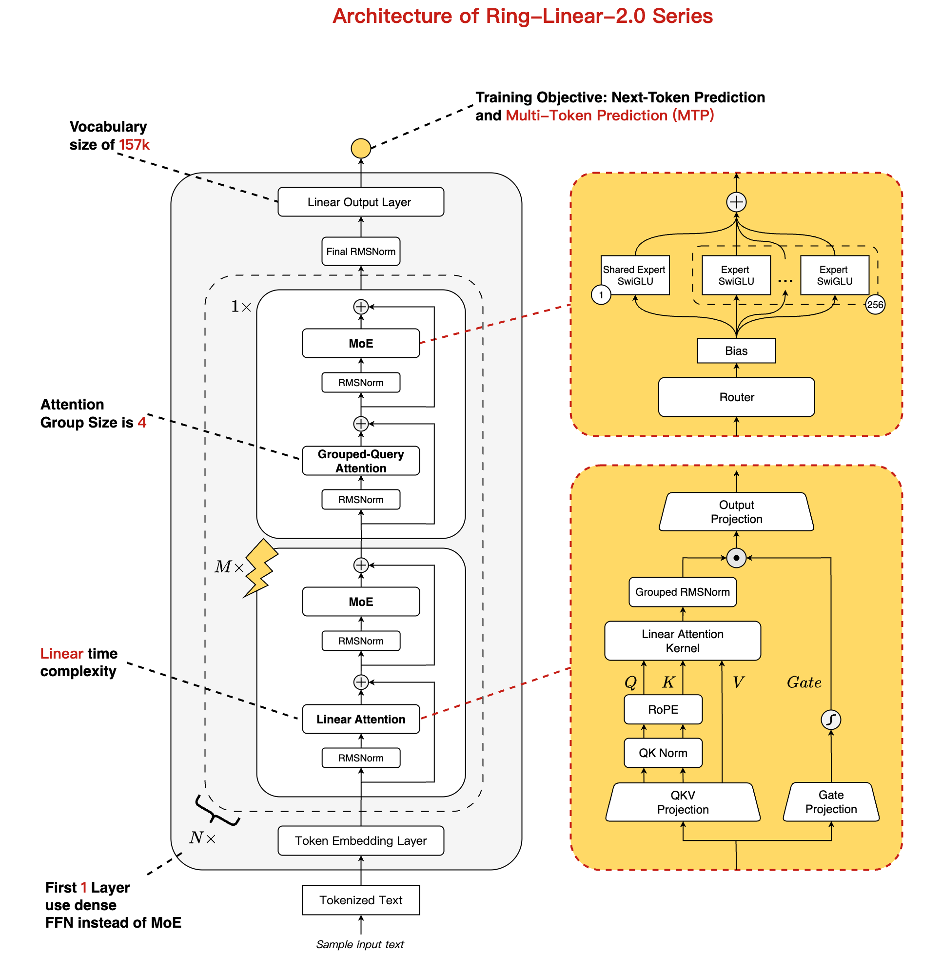 ์ฒ๋ฅผ ์ฑํํ์ฌ, ๋ฐ์ง(dense) ๋ชจ๋ธ ๋๋น ์ถ๋ก ๋น์ฉ์ 1/10 ์์ค์ผ๋ก ์ ๊ฐํ๋ค. ๋ํ ์์ฒด ๊ฐ๋ฐํ ๊ณ ์ฑ๋ฅ FP8 ์ฐ์ฐ์ ๋ผ์ด๋ธ๋ฌ๋ฆฌ 'linghe'๋ฅผ ํ์ฉํด ํ๋ จ ํจ์จ์ 50% ํฅ์์์ผฐ์ผ๋ฉฐ, ์ด ์ํคํ