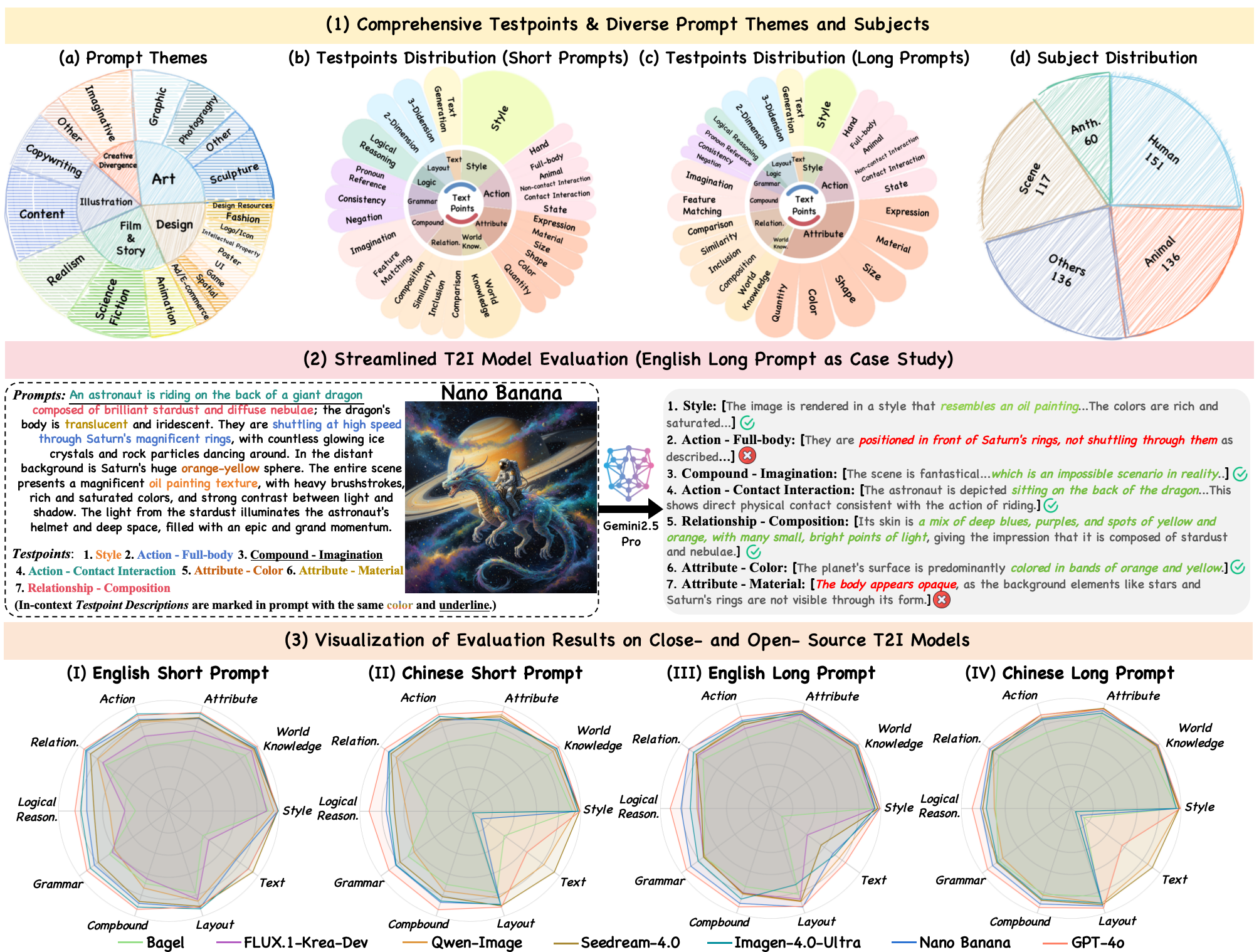 ์คํธ-์ด๋ฏธ์ง(T2I) ์์ฑ ๋ชจ๋ธ์ด ํ๋กฌํํธ์ ์๋ฏธ๋ฅผ ์ผ๋ง๋ ์ ํํ๊ฒ ๋ฐ์ํ๋์ง ํ๊ฐํ๋ ํตํฉ ๋ฒค์น๋งํฌ UniGenBench++๋ฅผ ์ ์ํ๋ค. ๊ธฐ์กด ๋ฒค์น๋งํฌ๊ฐ ํ๋กฌํํธ ๋ค์์ฑ, ๋ค๊ตญ์ด ์ง์, ์ธ๋ถํ๋ ํ๊ฐ ๊ธฐ์ค์ด ๋ถ์กฑํ๋ ํ๊ณ๋ฅผ ๊ทน๋ณตํ๊ธฐ ์ํด, 5๊ฐ ๋ฉ์ธ ํ