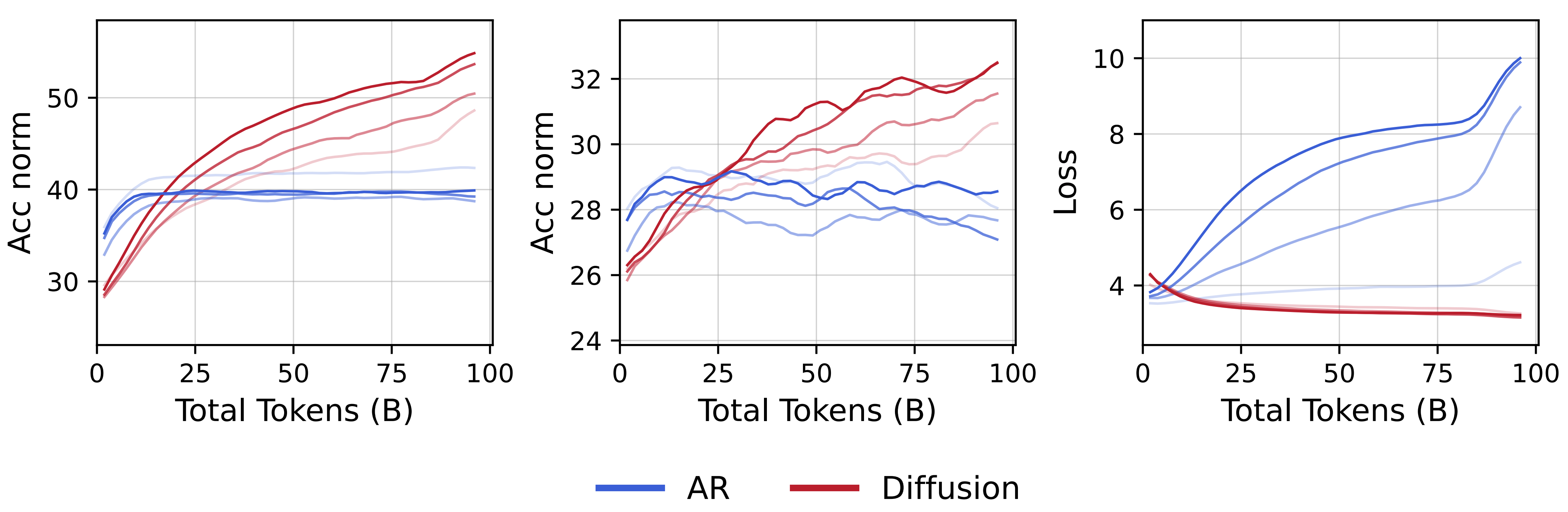 ์ฆํ๋ค. ์ด ์ฐ๊ตฌ๋ ๊ณ ์ ํ ๋ฐ์ดํฐ๊ฐ ์ ํ๋ ํ๊ฒฝ์์ ๋ฐ์ดํฐ๋ฅผ ๋ฐ๋ณต ํ์ต์ํฌ ๊ฒฝ์ฐ, DLM์ด AR ๋ชจ๋ธ์ ์ฑ๋ฅ์ ์ผ๊ด๋๊ฒ ๋ฅ๊ฐํ๋ '๊ต์ฐจ(Crossover)' ํ์์ ๋ฐ๊ฒฌํ์ผ๋ฉฐ, ์ด๋ DLM์ ์์ ๋ฌด๊ด(any-order) ๋ชจ๋ธ๋ง๊ณผ ๊ณ ๋ฐ๋ ์ฐ์ฐ ํน์ฑ ๋๋ถ์ด๋ผ๊ณ ๋ถ์ํ๋ค. ๊ฒฐ๋ก ์ ์ผ๋ก DLM์ ์ ํ๋ ๋ฐ์ดํฐ๋ฅผ '์ง๋ด์ด' ํ์ตํ๋ ๋ฐ ๋งค์ฐ ๊ฐ๋ ฅํ '์ํผ ๋ฐ์ดํฐ ํ์ต์'์์ ์์ฌํ๋ค.