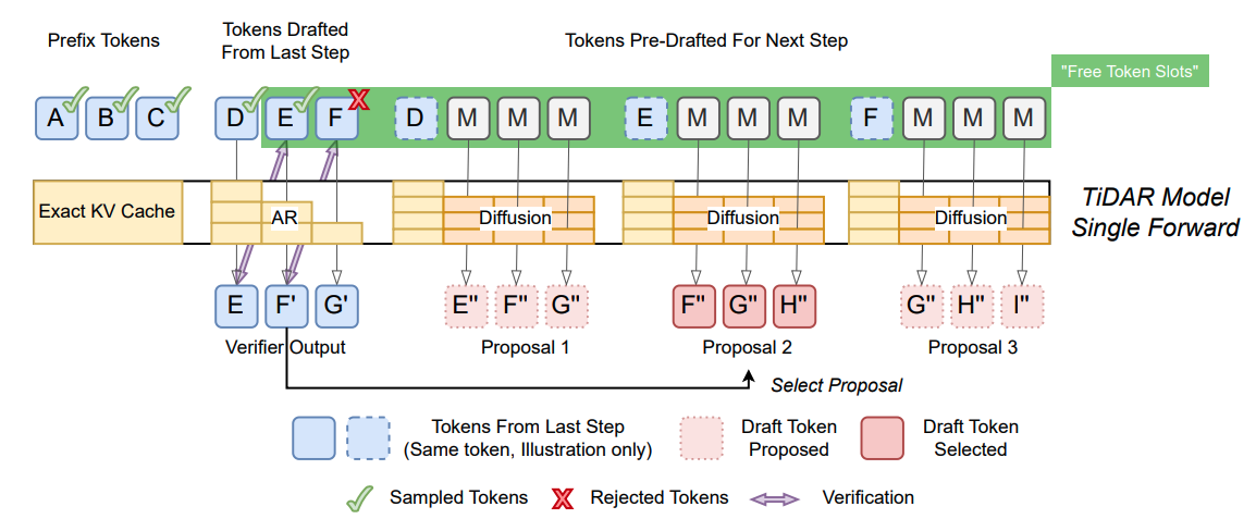 'TiDAR'๋ ๋ํจ์ ๋ชจ๋ธ์ ๋น ๋ฅธ ๋ณ๋ ฌ ์์ฑ ์๋์ ์๊ธฐํ๊ท(AR) ๋ชจ๋ธ์ ๋์ ํ์ง์ด๋ผ๋ ์ฅ์ ์ ๊ฒฐํฉํ ์๋ก์ด ํ์ด๋ธ๋ฆฌ๋ ์ธ์ด ๋ชจ๋ธ ์ํคํ