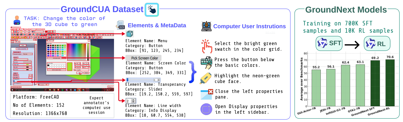 'GroundCUA'๋ฅผ ์๊ฐํ๋ค. GroundCUA๋ 87๊ฐ ์ ํ๋ฆฌ์ผ์ด์