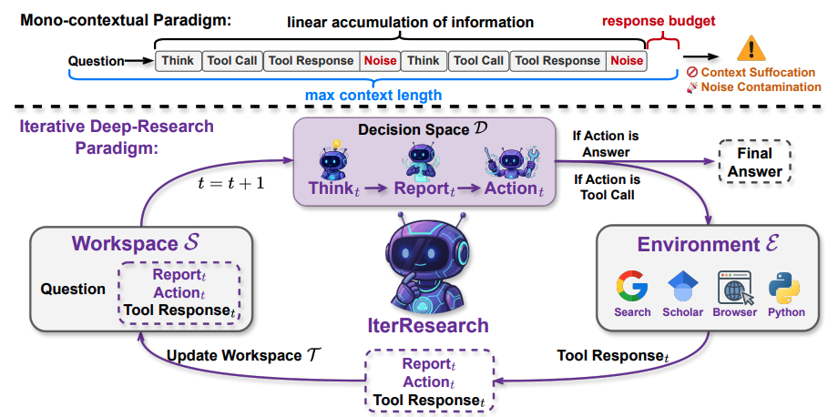 'IterResearch'๋ ์ฅ๊ธฐ ํ์(long-horizon) ๋ฆฌ์์น ์์ด์ ํธ๊ฐ ๋จ์ผ ์ปจํ