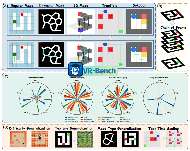 ์ ๊ธฐ๋ฐํ VR-Bench๋ฅผ ์๊ฐํ๋ค. 7,920๊ฐ์ ์ ์ฐจ์ ์ผ๋ก ์์ฑ๋ ๋น๋์ค๋ก ๊ตฌ์ฑ๋ ์ด ๋ฒค์น๋งํฌ๋ฅผ ํตํด, ์ฐ๊ตฌ์ง์ ๋น๋์ค ๋ชจ๋ธ์ด ๊ฐ๋