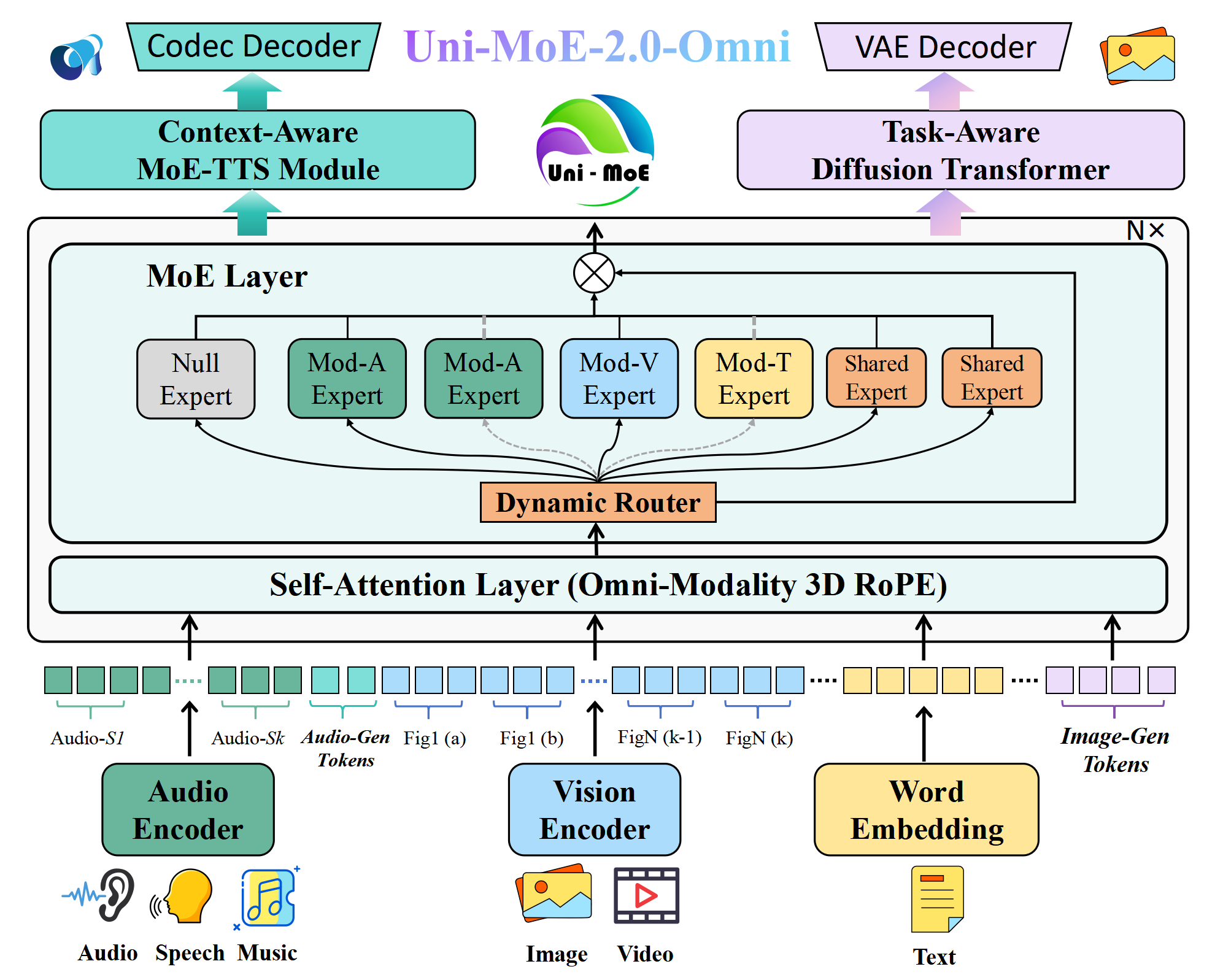 Uni-MoE 2.0์ ์ธ์ด ์ค์ฌ์ ๋ค์ค ๋ชจ๋ฌ ์ดํด, ์ถ๋ก ๋ฐ ์์ฑ์ ์ํ ์์ ์คํ ์์ค ์ด๋๋ชจ๋ฌ ๋๊ท๋ชจ ๋ชจ๋ธ(OLM)๋ก, ๋์ ์ฉ๋์ ์ ๋ฌธ๊ฐ ํผํฉ(MoE) ์ค๊ณ์ ์ ์ง์ ํ์ต ์ ๋ต์ ํตํด ๊ตฌ์ถ๋์๋ค. ์ด ๋ชจ๋ธ์ ํ