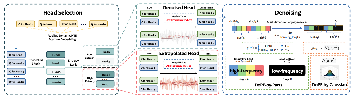 DoPE(Denoising Rotary Position Embedding)๋ ํธ๋์คํฌ๋จธ ๋ชจ๋ธ์ ์์น ์๋ฒ ๋ฉ(RoPE)์ด ๊ฐ์ง ๊ธธ์ด ํ์ฅ์ฑ์ ํ๊ณ๋ฅผ ๊ทน๋ณตํ๊ธฐ ์ํด ์ ์๋ ํ๋ จ์ด ํ์ ์๋ ๋ฐฉ๋ฒ๋ก ์ด๋ค. ์ฐ๊ตฌ์ง์ ์์น ์ธ์ฝ๋ฉ์ด ์ ์ฉ๋ ์ดํ