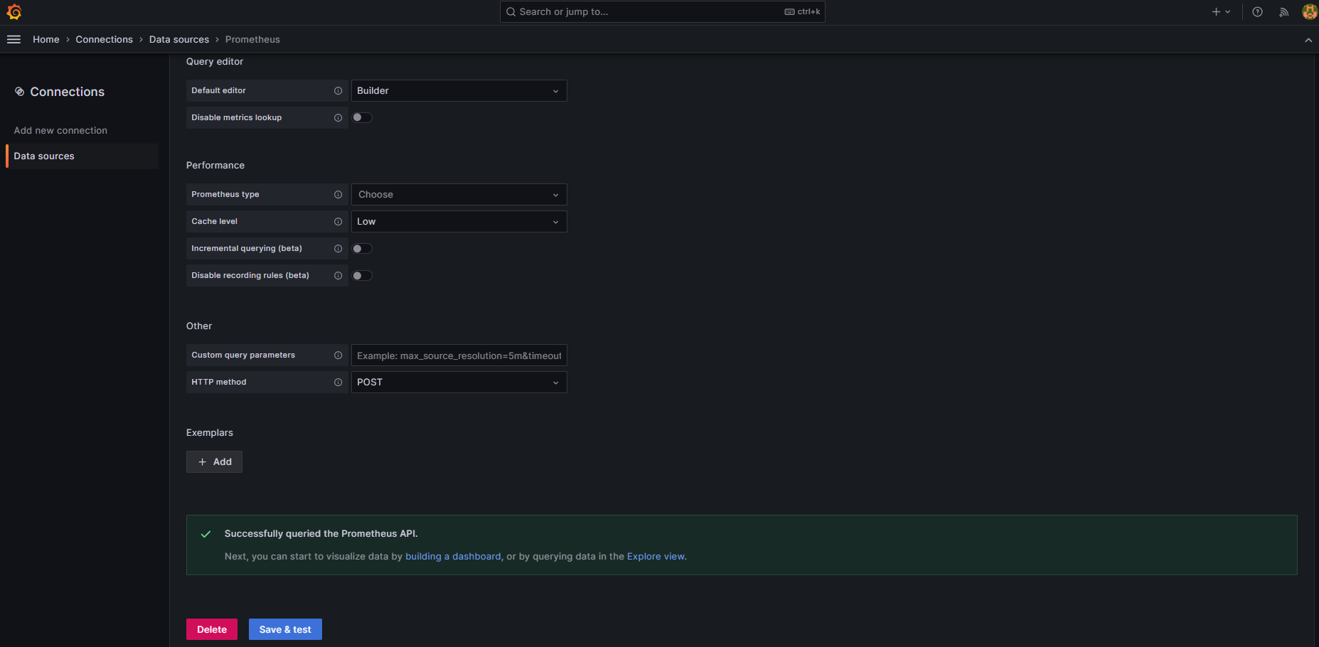 4. Save & Test 클릭 -> "Successfully queried the Prometheus API." 메시지 확인
