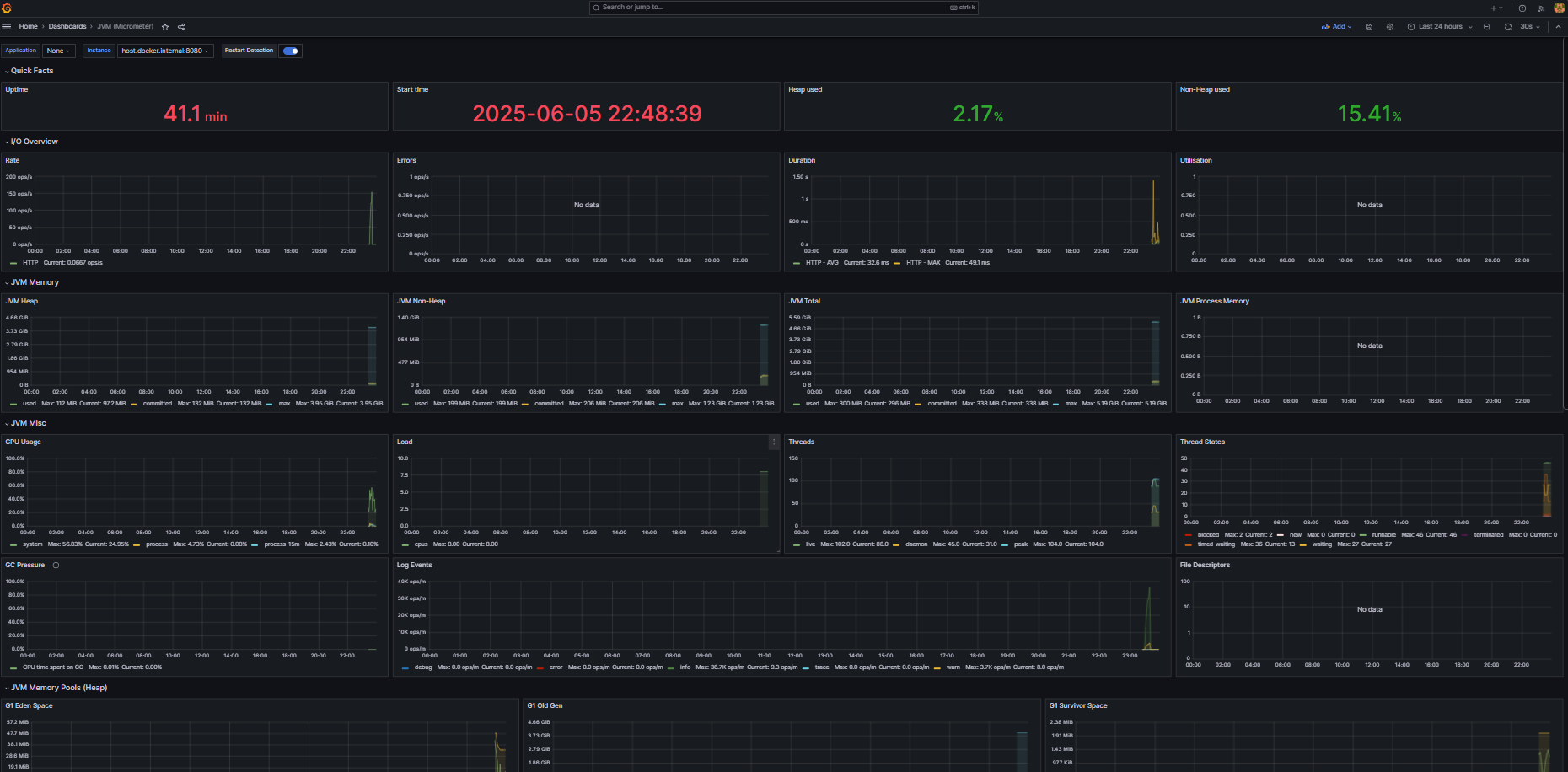 이번 글에서는 Spring Actuator를 활용해 서비스 자체의 상태(CPU, 메모리 사용량, 애플리케이션 기동 시간 등)를 모니터링하는 방법과 k6를 통해 수행한 부하 테스트 결과를 Grafana로 시각화하는 과정을 직접 구성해보았다.