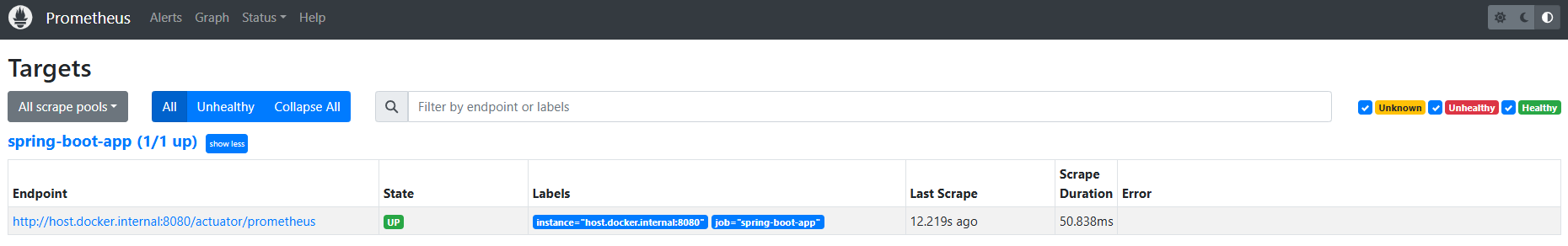 Status > Targets에서 Spring Boot 앱이 UP 상태인지 확인
