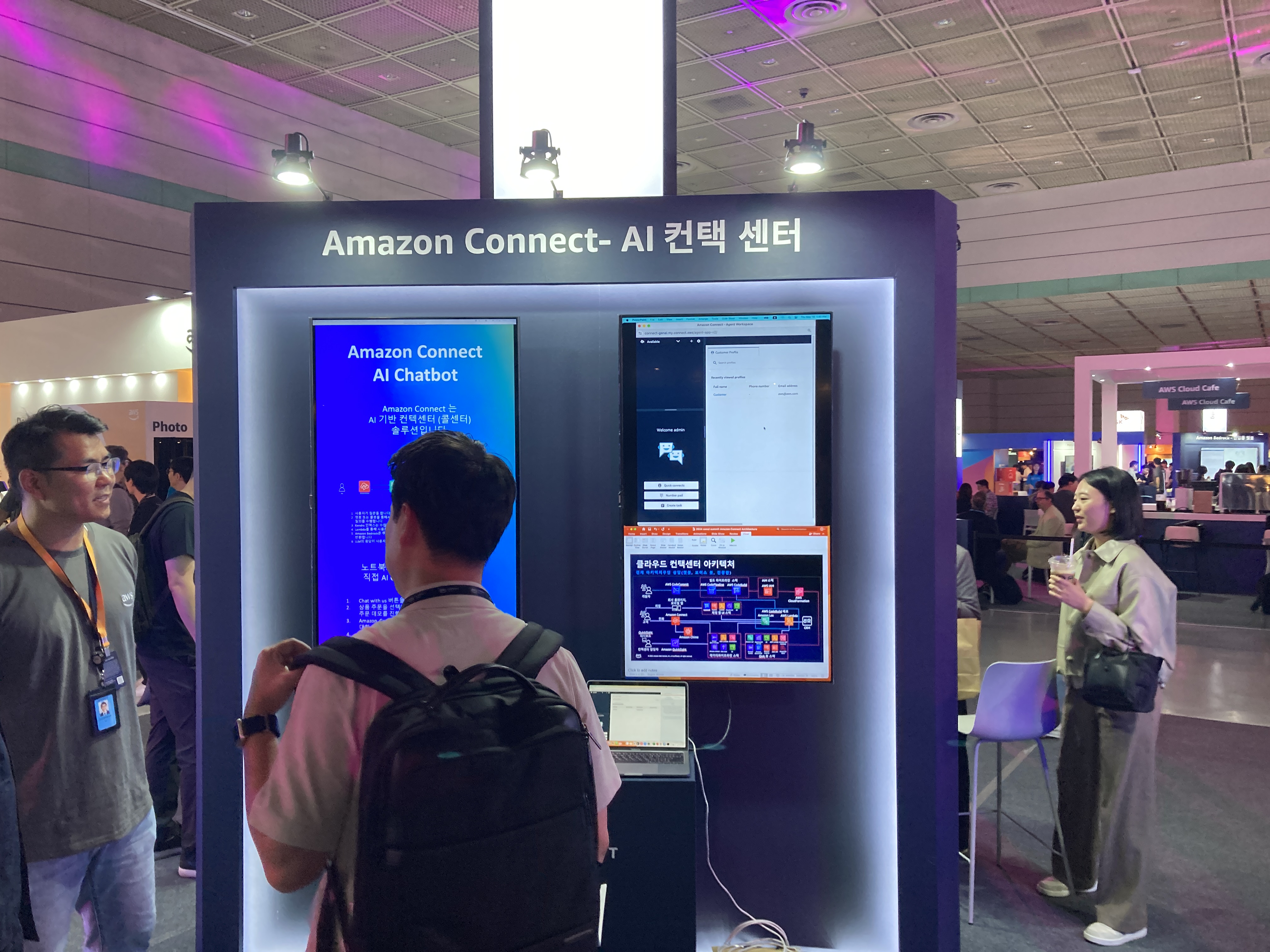 개인적으로 가장 마음에 들었던 부분이었는데, 등록 데스크에서 등록 후 곧바로 엑스포 부스로 넘어갈 수 있도록 동선을 최적화하였다는 점이다. 이전에는 등록 데스크 등록하고 한창을 돌아가야지만 입장을 할 수 있었는데, 이번에는 입장할 수 있는 경로를 다양화하고, 이동 경로를 최적화 하여서 내가 원하는 부스와 세션을 빠르고 신속(?)하게 체험할 수 있어서 좋았다. 엑스포에는 MSP 대표 3사를 포함한, 3rd Party Solution/Service 부스가 전시되어 있었고, 메인 주제가 GenAI 관련 주제가 많다보니 AWS가 마련한 부스 대부분이 GenAI 관련 체험관으로 이루워졌다.