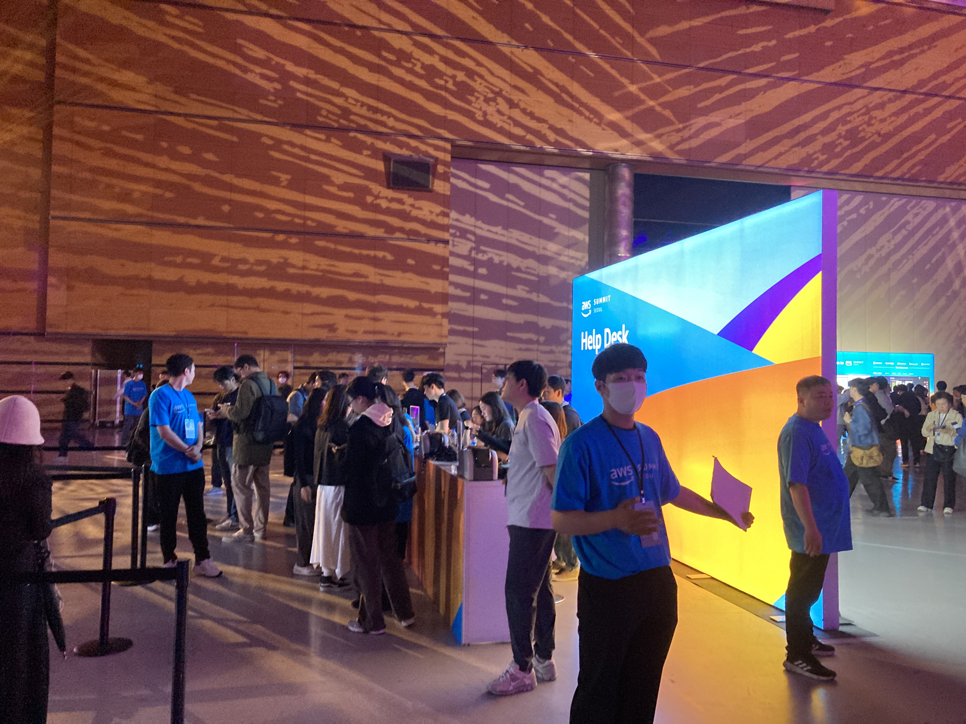 서론에서도 이야기했듯, 올해 10주년 행사로 진행되다보니 등록 데스크부터 진입방법이 달랐다. 몇 번의 Summit을 참여한 기억을 되집어 보면, 보통은 코엑스 북문 1층의 등록데스크에서 등록 후, 원하는 세션 공간으로 이동하거나 Expo 부스로 이동하는 선택을 진행했었는데, 올해는 3층의 가장 넓은 공간에 등록 데스크 공간이 마련이 되었다. 뿐만 아니라, 다양한 세션을 동시에 진행할 수 있도록 마름모 모양의 4개의 오픈 세션과 AWS 자격증 부스가 함께 있어서 10주년 이벤트에 엄청난(?) 힘을 실어주었음을 확인하였다.