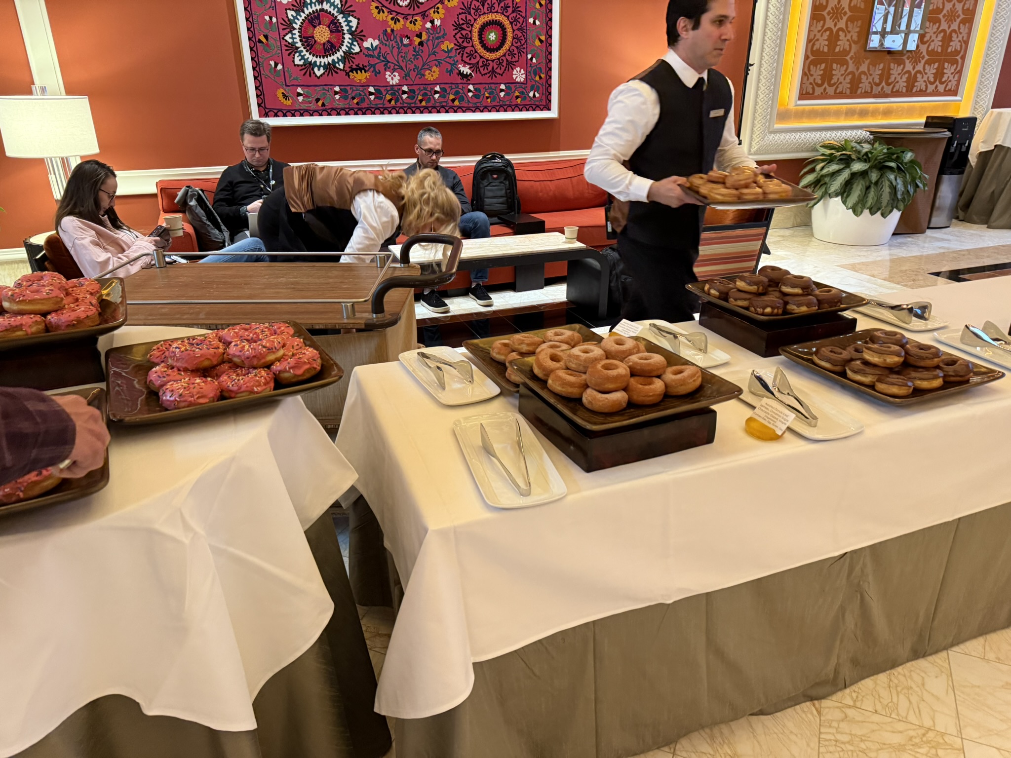 세션이 종료된 후, 베네시안으로 돌아가기 위해 길을 나서던중, 조식을 참여하지 못한 참여자들을 위해서인지 세션장 복도 곳곳에 크기가큰 도넛츠와 음료가 구비되었습니다. 빵을 좋아하는 사람으로써 커피&도넛(광고 문구 아닙니다~~) 은 참을 수 없기에 큰거 두개를 집어 맛있게 냠냠했습니다.(조식에 도넛까지 먹으니 배가 엄청 부르더라구요 ㅋㅋ) 덕분에 점심은 스킵했습니다.^^
