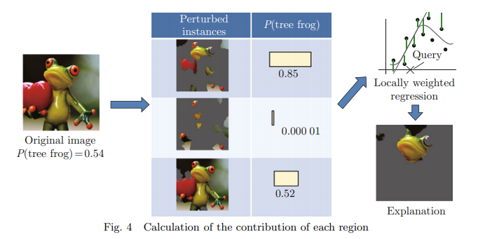 - 'Locally weighted regression' : 주어진 입력(변형된 이미지)에 대한 모델의 출력(나무 개구리일 확률)의 변화를 분석하는 통계적 방법
