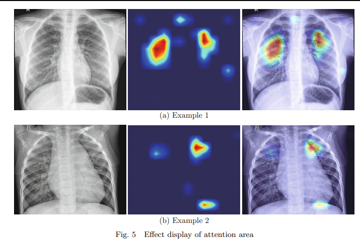 - [fig.8] 해석된 영역의 분포는 폐에만 국한되지 않고 흉부 전체에 분포. → 해석 가능성 분석에 주의 가중치를 추가함으로써 모델은 CXR의 중심에 위치한 폐 영역에 더 집중.