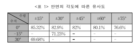 가장 높은 유사도는 안면에 대한 수직 각도가 0도 + 수평각도가 ±15°일 때 85.32%