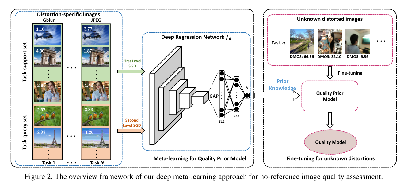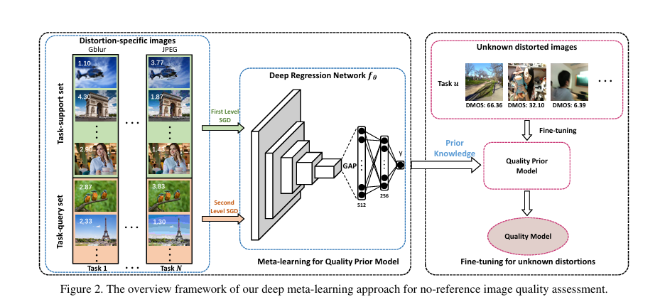 Figure 2. 무참조 이미지 품질평가(NR-IQA)를 위한 딥 메타러닝 접근 방법의 전반적인 프레임워크