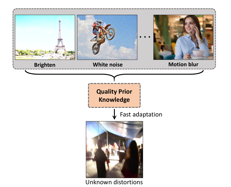 → 이러한 왜곡들로부터 학습된 품질 사전 지식이 "Unknown distortions"라고 표시된 알려지지 않은 왜곡에 적용되는 모습.