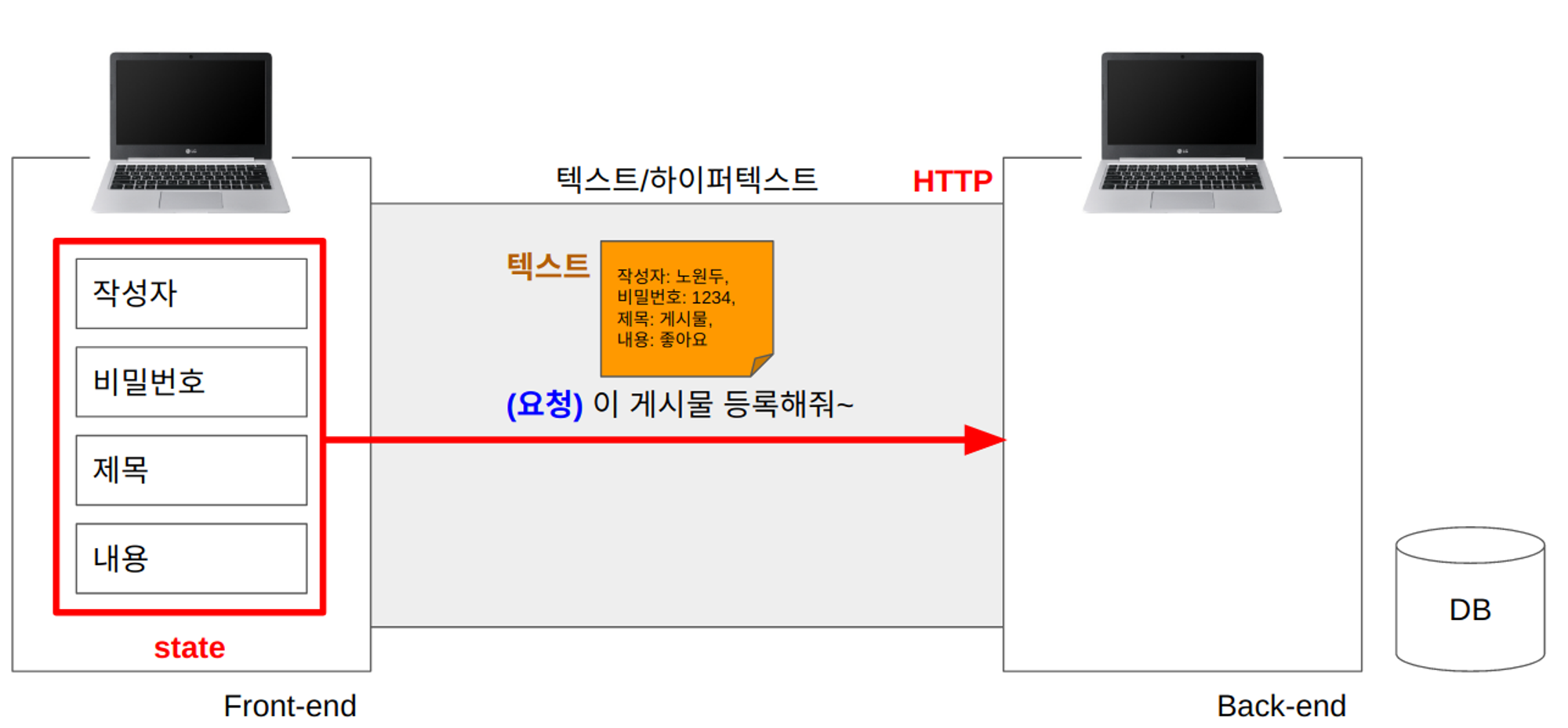 웹 브라우저에서 홈페이지(Front-end)가 실행중이라면, 작성한 게시물 텍스트 데이터를 HTTP를 통해 Back-end 컴퓨터로 보내고 Back-end 컴퓨터에게 이 데이터를 데이터베이스에 저장해 달라고 요청한다.