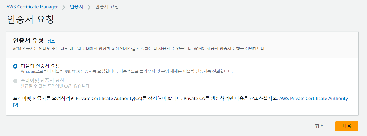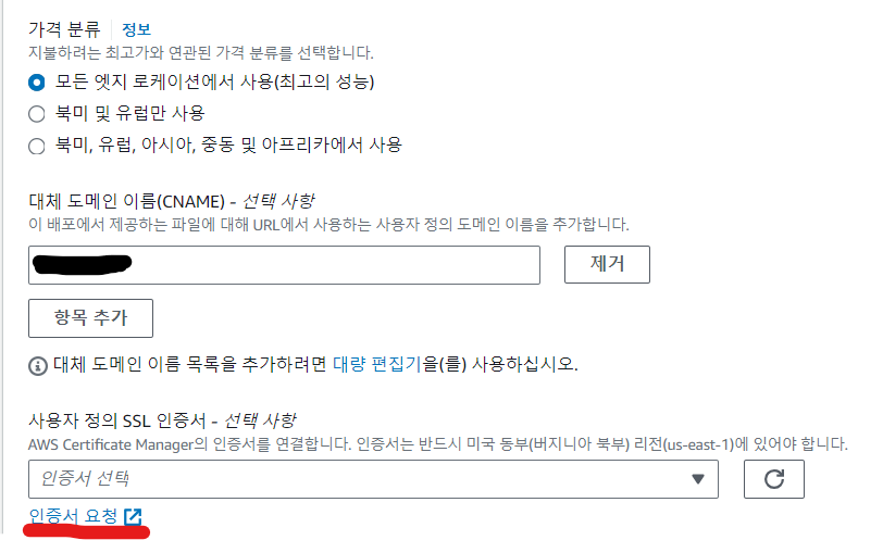 대체 도메인 이름에 Route53에서 등록했던 도메인 이름 작성 후 SSL 인증서 요청 클릭