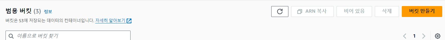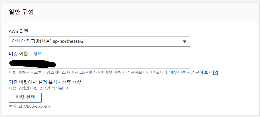AWS 리전과 버킷 이름 지정 후 버킷 만들기(다른 항목은 건들이지 않음)