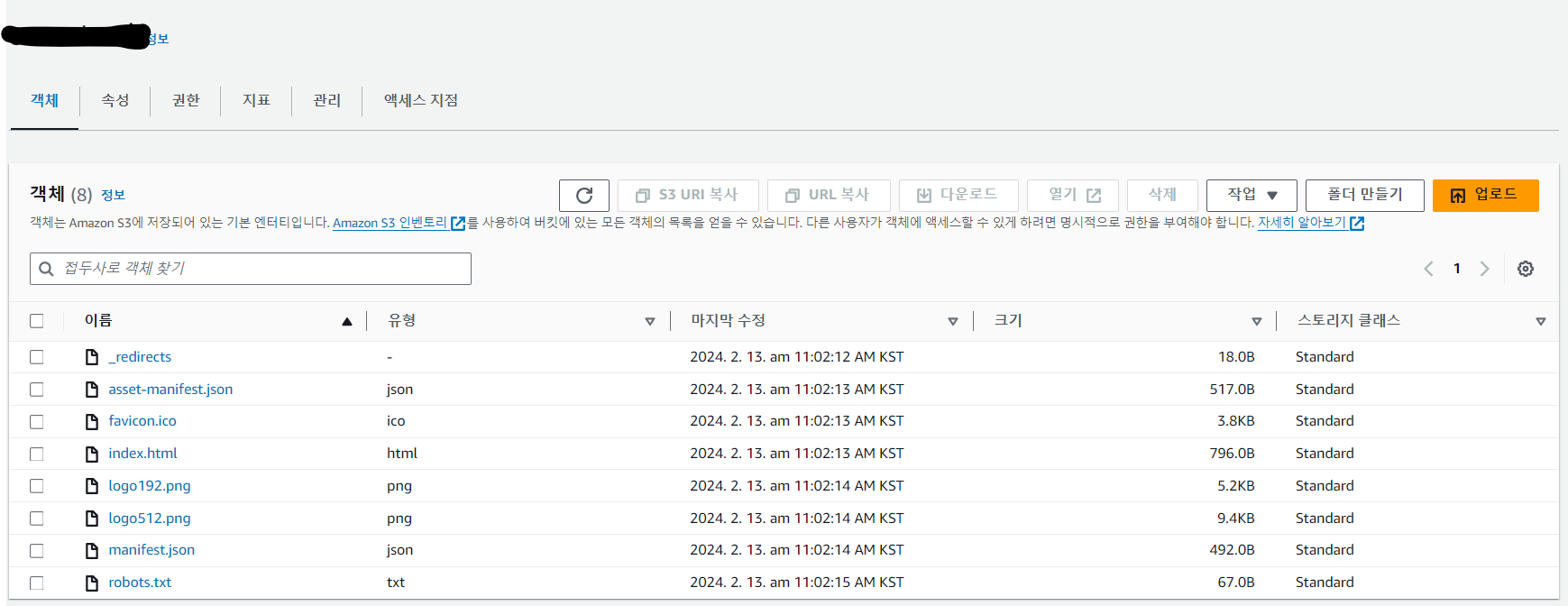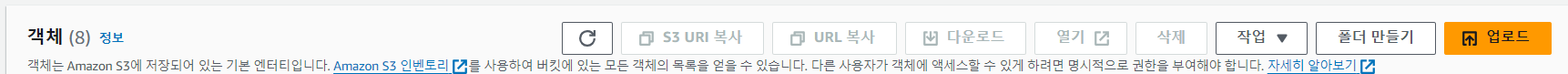 생성한 버킷에 build 파일 모두 업로드(폴더자체x, 각 파일별 업로드)
