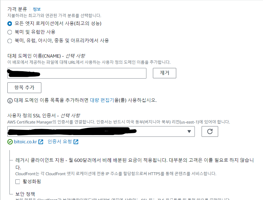Origin domain에 방금 만든 S3 버킷 선택, 원본 엑세스는 Legacy access identities 선택